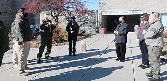 SALT LAKE CITY — Members of the Diocese of Salt Lake City’s jail ministry recently received gifts from the Salt Lake County Sheriff’s office to thank them for the work they do for the prisoners at Oxbow Jail. On Nov. 30, Deacon Joaquin Mixco, the Diocese of Salt Lake City’s coordinator of Detention Ministry for Salt Lake County; Father Eleazar Silva of Sts. Peter and Paul Parish; and Michelle Beesley, a member of the jail ministry, met outside the jail with corrections officers to accept insulated coffee mugs for all of the ministers.