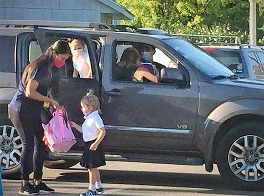 At St. Andrew Catholic School, kindergarten teacher Erin Yale took her students outside on the first day for an activity where they were able to social distance and remove their masks safely. After the activity, which involved answering questions and sharing information about themselves, students replaced their masks before returning to the classroom.