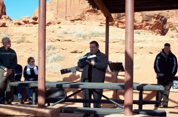 by Lorraine Boyce ST. GEORGE — Reverend Jimi Kestin, pastor of Solomon’s Porch Foursquare Fellowship, organized the second annual Prayer for St. George which was held at Pioneer Park in St. George Jan. 1, 2007. Members from various Christian churches assembled to give thanks and to pray for the new year. Worshipers at the park hailed from many local faith communities, including St. George Catholic Church, United Methodist Church, Solomon’s Porch Foursquare Fellowship, New Covenant Christian Center, New Life Christian Center, Harvest Christian Fellowship, Cross Point Christian Fellowship, and Oasis Community Church. Father Eleazar Silva, Vicar of St. George Catholic Church, asked the assembly to face the city and raise their hands in prayer while he offered three blessings for the city and its inhabitants. He said, "the main theme of Christianity is unity and we cannot be true Christians if we are not united." Mayor Dan McArthur spoke of the pioneers who founded the city and related that "he believed in Divine intervention and guidance… we need that help in all our lives." Reverend Bernie Larson, pastor of the New Covenant Church, and Reverend Buddy Harrington, Pastor of the United Methodist Church, offered prayers of thanksgiving and asked for unity among all Christians. Pastor Harrington also prayed for the people fighting in the armed forces, asking God "to wrap His arms around the soldiers who are protecting us."