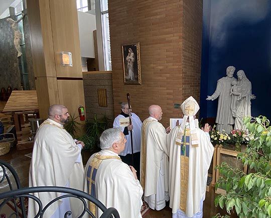 Bishop Oscar A. Solis blesses the new statue of Saint Joseph at Saint John the Baptist Catholic Church following the 11 a.m. Mass on Jan. 7. Fr. Stephen Tilley, pastor, said that after the Year of St. Joseph ended in 2021, several parishioners requested that the parish obtain a depiction of Jesus’ foster father to place in the church. After praying about it, Fr. Tilley wanted to put the statue with the church’s existing statue of the Blessed Virgin Mary and the infant Jesus to create a representation of the Holy Family. The parish contacted the artist Warren Archer to sculpt the St. Joseph statue. Archer was present at the Jan. 7 Mass at which the statue was blessed. Courtesy photo/Liz Canto