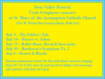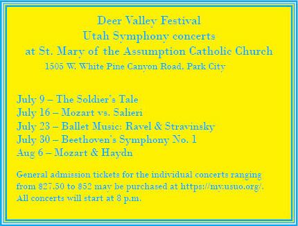 PARK CITY — This summer St. Mary of the Assumption Catholic Church will be the venue for five Utah Symphony concerts as part of the Deer Valley Music Festival’s Chamber series.