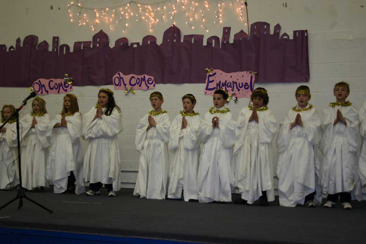 BOUNTIFUL — Saint Olaf pre-kindergarden through fifth grade students put on a pageant, "Carols of Advent," for the Middle School and their parents before recessing for the Christmas holiday Dec. 19. The pageant was a great success. The Saint Olaf gym was full of parents and special guests. Saint Olaf First Grade Teacher Carolyn Smillie wrote the script and obtained the music. Saint Olaf Music Director Radu Noaghiu accompanied on the piano. The pageant began with the Annunciation. They portrayed a nativity and the children had roles around the manger including playing animals. The pageant ends with all the children singing "Go Tell it on the Mountain…that a savior is born." The the world about the birth of Jesus. "This is the first year Saint Olaf has had this pageant, and I want it to become a tradition," said Smillie. "I did this at Saint Andrew’s Catholic School in Helena, Mont., and wanted to continue the tradition. I was shocked when I heard Saint Olaf did not have a Christmas program because at my old school it was the crowning event of the year. So I was excited about getting it started. "I took parts from the Living Creche program, which gives you scripture passages, and Christmas legends," said Smillie. "Young children are really interested in that. If you can tie good stories with the Bible scriptures, then it really makes the story come alive for the children. "The music I used are all traditional Christmas carols," said Smillie. "The first carols are from the Creche program, but the last part of the program are from old English tales on Christmas Day. The kindergarten students sang about the bells in the chapels talking to each other. They bells in St. Clemens say ‘Oranges and Lemons.’"