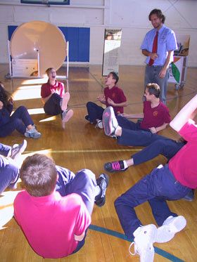 BOUNTIFUL — St. Olaf Middle School students experienced a traveling science center as an early Catholic Schools Week project Jan. 23-25. Leonardo on Wheels (LOW) is a traveling science center that operates out of a 25-foot trailer. LOW includes 15 cart-mounted interactive science exhibits or activities, each on a particular theme or subject. The exhibits are focused on the middle school science curriculum. The first day students explored the traveling science center in an unstructured manner learning about and experiencing each exhibit. The second and third days, students were given a Leonardo notebook and took more of an experiment-minded approach. They received guided instruction, formed hypotheses, made measurements, collected data, experimented for results, and recorded their observations to see if they proved or disproved their hypotheses. Tony Anderson is a LOW liberator instructor because he said he tries to liberate students from routine, sometimes dull, experiences in science, and tries to make it fun and exciting by allowing students to liberate their minds. He graduated from the University of Utah with a Bachelor of Science Degree in Geography. Rodney Kopish is a LOW illuminator instructor. He said he illuminates young minds and frees them from the darkness of scientific ignorance and apathy. He tries to illuminate their passion for learning while having fun with science. Kopish was a biology teacher prior to LOW. Anderson said LOW is an extension of the Leonardo at Library Square in Salt Lake City. Leonardo is the new name for the old public library in Salt Lake City. The traveling Leonardo was launched in 2004. LOW is part of the Utah Science Center at the Leonardo at Library Square. Dr. Joe Andrade, director of the Utah Science Center component of Leonardo, said an earlier version of LOW was started in 1990. Andrade and three other not for profit organizations, who founded Leonardo, spoke with the Utah State Office of Education and discovered that what was needed was science curriculum targeted toward the middle school levels. The Leonardo will open as a science museum in 2009 at Library Square. Anderson and Kopish present LOW to schools throughout Utah. They set up their exhibits and stay for three to five days at a time so the middle school science classes can experience the various exhibits. They also try to spark or generate ideas for science fair projects and additional independent study and research after LOW has left the school. LOW provides teachers and students with hands on experience based on the Utah State Office of Education core science curriculum. It also helps students connect every-day items with the science and technology that make them work. St. Olaf students examined Jim Haggart’s finger under a microscope and were able to see what a potential cancer cell looks like. Haggart is the St. Olaf middle school science teacher. They also touched on some biology and genetics. Anderson said one of this year’s topics in the Utah State Legislature is energy efficiency so they brought in a generator bike. Students were given an opportunity to actually pump the generator bike to see how much power or energy is needed to pump enough electricity to turn on a 25 watt light bulb and a 100 watt light bulb. They learned to multiply their findings and apply them to how much energy is needed to light their homes or the school. The experiment helped them understand the energy concept and put it into a larger perspective. Students also realized florescent light bulbs consume less power than incandescent light bulbs. The students also threw the dice on a craps table exhibit to experience the statistics of probabilities. The concept was to teach them we all live in a statistical and somewhat uncertain world, and that such uncertainty can be accepted, even celebrated, rather than solely feared. The LOW exhibits offered St. Olaf students a first-hand experience rather than simply receiving a large amount of information through a lecture or text book. For more information about Leonardo on Wheels, visit www.leonardo.org, or Utahsciencecenter.org.