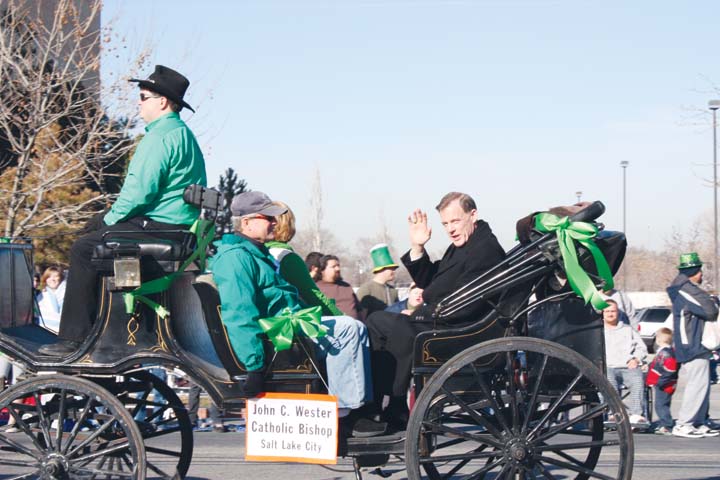 SALT LAKE CITY — "From Kerry to Promontory" was the theme for the 30th annual Saint Patrick’s Day Parade in Salt Lake City March 14. Kerry is a county in Ireland and Promontory Summit is the point in Utah at which the Union Pacific and Central Pacific railroads met to unite the East and the West in the late 19th century. Irish workers contributed to the development of these railroads with their hard labor. Nowadays, their descendants continue to unite people through the celebration of their patron saint’s feast. The color green, shamrocks, and leprechauns dominated the Gateway mall and the sound of the pipe bands filled the air while Irish dancers made everyone’s eyes bounce up and down along with their traditional hair-curls. The grand marshal this year was Doctor John Wilson, a member of the Hibernian Society, which organizes the parade every year. There were about 145 entries for the parade this year, said Greg Neville, parade co-chairman. The Knights of Columbus were among the first to march down the parade route, while the Most Rev. John C. Wester, bishop of the Diocese of Salt Lake City, followed them in a carriage. Catholic Schools and parishes joined the celebration with cheer squads, music bands, and floats. "I was pleasantly surprised at the number of participants," said Mattie Reed, freshman dean of students at Judge Memorial Catholic High School in Salt Lake City. Reed said this was the first time she organized the school’s entry for the parade and that the students had a "good and positive spirit." As much fun as it is to watch the parade, it is better to be part of it, said Julia Rakowski, student at Saint Francis Xavier School in Kearns. "It’s really exciting to shake people’s hands and to yell at them. It’s fun to see all the little kids," she said. The parade was also an opportunity to celebrate legislative accomplishments like the fall of the Zion Curtain, a glass barrier meant to protect children from seeing alcoholic drinks that many argued did nothing but complicate the servers’ job. For others, the parade was a chance to celebrate the memory of those who have died. The Mac’s Band, a group of Judge Memorial graduates in their 50s who have participated in the parade since it started, played one last basketball game for the late Larry H. Miller. Friends and family of Michael Starks, a Utah State University freshman who died of alcohol poisoning during a fraternity initiation, marched next to a picture of Starks on a coffin to raise awareness on the dangers of hazing. From Kerry to Promontory, everybody is Irish on St. Patrick’s Day and anything could be a motive for celebration, as long as there is green.