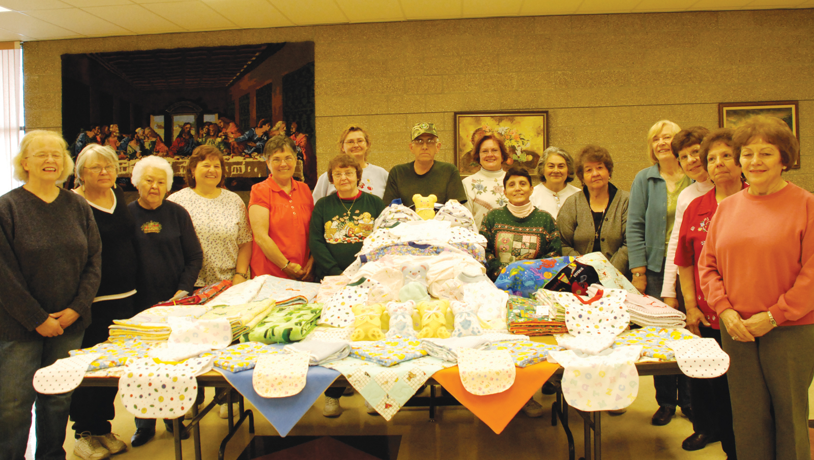 by Pat Bergeron and Barbara Stinson Lee Intermountain Catholic LAYTON — Almost everyone at St. Rose of Lima Parish in Layton knows the parish social hall is booked solid for Monday mornings. That’s when the sewing angels take over the place, and the results make life a little better for babies born in poverty and veterans alike. The sewing angels – 24 women and one man, meet after the 9 a.m. Mass and make blankets, bibs, burp cloths, receiving blankets, nightgowns, and stuffed bears, all of which are donated to Birthplace of Ogden, St. Martha’s Baby Project (partnered with Holy Cross Ministries and Catholic Community Services), Birthright, and Sub for Santa programs. They also make lap robes for the Veterans Medical Center, Veterans’ Home, and nursing homes in Layton. When they aren’t sewing, they knit and crochet hats, mittens, and scarves for people who are homeless and underprivileged children.