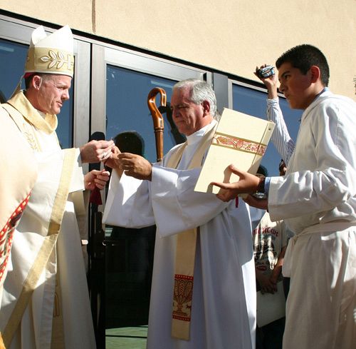 MIDVALE — "All are welcome in this place" was sung as the standing-room only congregation came into the beautiful new chapel of Saint Therese of the Child Jesus Sept. 27. The Most Rev. John C. Wester concelebrated the Mass with Father Martin Diaz, pastor of Saint Therese of the Child Jesus, and many of his brother priests from throughout the Diocese of Salt Lake City who came to the Mass of Dedication. Saint Therese was rebuilt after a small burning prayer candle started a fire that damaged the church in January 2008. The fire caused about $300,000 in damage to the main sanctuary of the church’s chapel. Since then Masses have been celebrated in the parish social hall, which is also being reconstructed. The kitchen will be completed in about two weeks. "We have added on 2,000 square feet to the end of the old church," said Tom Stevens, contractor, of Tom Stevens Construction. "So the church went from 4,000 square feet to 6,000 square feet. The expansion was primarily for the sanctuary, but it gave them an opportunity to enlarge the rest rooms, the sacristy and the foyer. Now there is a children’s chapel/cry room on both sides of the chapel. They had out grown the church, which could seat 400. The new church seats 600 people. The parking lot had to be redone as well. "They are redoing the altar and the sacristy in the little rock church, and are putting in a rest room," said Stevens. "They are making it more comfortable for daily Mass. The parishioners from the past and present were so excited to have the new church built because they said they have waited a long time. Those who have moved away still stay connected with Saint Therese because of family ties. Stuart Hembury, 65, has been a member of Saint Therese since he was a baby. "I was an altar boy, had my First Communion, Confirmation, and I was married in the little rock church 43 years ago," said Hembury. "What is so nice about this day is that it is for all the people, not just one specific group or just the people of Saint Therese Parish. We have a big Hispanic community here and we all had fun raising funds to build our new church." "I sat in this church with my first wife, Mary, since we got married in 1947," said Owen Evans. "Everyone thought I was Catholic. Then she died in 1976, and I married Donna Hembury in 1984, in Saint Therese of the Child Jesus. Donna converted to the Catholic Church when she married her first husband George Hembury, who also died in 1976. Then I was baptized into the Catholic Church in 1992. I was baptized and married by Father James Semple, who was the pastor. "We were here when they built the church to start with and have seen it grow to what it is today," said Evans. "I was married in the little rock church 44 years ago," said Mike Gonzales, who has been a member of Saint Therese of the Child Jesus Parish for many years. His daughter, Sophia Gonzales-Pease was married in Saint Therese of the Child Jesus, and although she moved away, she came back to have her three daughter baptized there. "This means so much to me to come to this dedication," said Sophia. "It is fun to see my friends and their parents who have been members here for many years." Linda Gonzales, the wife of Mike and mother of Sophia, said she had five daughters and all of her grandchildren have been baptized at Saint Therese Parish. Linda used to be a soloist and cantor, and it meant a lot to her to sing in the choir for the Mass of Dedication for the new church. "I am so excited because we have waited a long time for this new church," said Linda. "I never thought we would see this day come to fruition. When we were married in the little rock church, there was only room for a few people on either side of us. They found a stone that said the little rock church was built in 1928." Rose Vigil was celebrating her 96th birthday as well as the celebration of the new Saint Therese Church. The intention of the 10 a.m. Mass was for her. The first Mass held in the Saint Therese Church that was destroyed by fire was for Rose’s daughter and son-in-law Nick and Connie Velarde on June 15, 1974. Rose was born in 1913, and has been a member of Saint Therese since the parish began in 1925. She has nine children, 50 grandchildren, 30 great-grandchildren, and some great-great-grandchildren. Rose prays the rosary every day. "I am happy today," said Rose. "I don’t always have a good day, and I always take a nap. But I have been awake all day." "In one heart and mind let us go rejoicing to the house of the Lord," said Bishop Wester as the Mass began in the social hall. It was a symbol of going from the old or make-shift church to the new church. Bishop Wester then handed Fr. Diaz the blue prints and the keys to the new church, without which the congregation could not enter. Fr. Diaz opened the doors and welcomed everyone in. Once inside, Bishop Wester said "This is an absolutely beautiful church. I cannot tell you how thrilled I am, how proud I am, and how joyful I am to celebrate this momentous occasion. "Fr. Diaz congratulations to you and your people," said Bishop Wester. "We give thanks to almighty God for all those who have worked so hard to bring us to this day, and for all of you who have joined us today from the civic community, from other faiths, the architects, contractors, those from the pastoral center, so many religious sisters, lay leaders, my brother priests and deacons, and the musicians and choir. All of this bespeaks how we are one people coming together to give thanks to almighty God. Certainly to all of you parishioners and those who have been here since 1925. Bishop Wester thanked Fr. Diaz and said he is a splendid pastor in every sense of the word, to which the congregation gave Fr. Diaz a standing ovation. "I am beyond excited and overwhelmed," said Fr. Diaz. "I am over the top, over joyed. This has got to be one of the greatest days of my life. It is not the church building, it is the 800 people who came to worship, pray, a