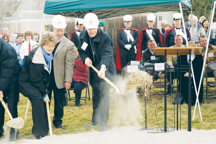 SANDY — American author John Updike wrote in his book "A Month of Sundays" that churches bore the same relation to God that billboards did to Coca Cola: They promoted thirst without quenching it. Lest Updike’s comment became true, parishioners of Saint Thomas More Parish mobilized and raised funds to update and extend the parish’s facilities, said Father David L. Van Massenhove, pastor. "We cannot invite people to join our parish if we do not have anything for them to do, to grow," he said during the groundbreaking ceremony Feb. 22. The Most Rev. John C. Wester, bishop of the Diocese of Salt Lake City, blessed the ground so that the new facilities would help parishioners and community members open to one another and welcome others as brothers and sisters. Bishop Wester also prayed for the safety of the architects and construction workers during the project. "For your glory and our well-being, may there be progress day by day," he said. With a hard hat on and shovel in hand, Bishop Wester then joined Fr. Van Massenhove; Father Paul J. McCarthy, parochial vicar of St. Thomas More; Honorable Kelvyn Cullimore, mayor of Cottonwood Heights; Steve Bartlett, president of the parish council; Jim McNeer, from the building committee; Ray Bachiller, head of capital campaign; and Roland and Patti Allen, parish members, to break ground before the enthusiastic eyes of the community. The ceremony concluded with a benediction by Fr. McCarthy. The capital campaign under the name "Growing together in faith," met its challenge goal of $3 million, said Jo Dorsett, director of the Rite of Christian Initiation of Adults (RCIA). The parish was founded in 1981 with 150 families. It currently serves about 1,200 households and has reached its capacity. The project includes the addition of a two-story wing to the existing parish center for more educational classrooms and meeting rooms, a remodeled parish hall, new and remodeled office space, and a new multi-purpose center that will allow the parish to host PARA (Parish Athletic Recreational Association) league events. "Our current gym is too small. It has no bleachers. It was a small room turned into a basketball court," said Dorsett. The new multi-purpose center will also provide space for youth ministry activities. "We want the youth to have their own ‘game room’ with pool and ping-pong tables," said Dorsett. "Once young people finish their sacraments, they fall away from the church. This will give them more to do with our parish community," said Nora Kennedy, pastoral assistant. Additionally, the 1.1 acre parcel of land the parish purchased will provide extra parking space and room for the food pantry. It is estimated the project will be complete in 14 months.