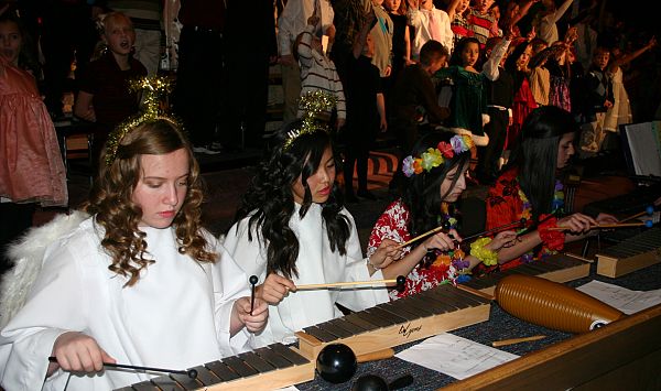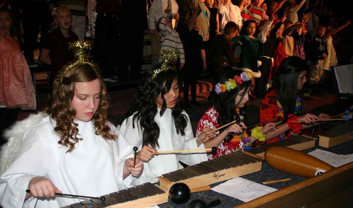 SALT LAKE CITY — Saint Vincent de Paul Catholic School’s student body received a standing ovation Dec. 15 for their Christmas performance of "Annunciation 2011," and the original finale Christmas carol "Jesus Is." Parent Michael O’Brien wrote the carol’s lyrics and Scott Larrabee, St. Vincent’s music director, composed the music. O’Brien also wrote the script to this year’s program, in which the audience witnessed a modern-day annunciation based on the popular TV show "American Idol." During the performance, the stage became the setting for God to announce the birth of Jesus in a Christmas carol competition between four choirs: the Surf and Sunshine Choir, the Peanuts Gang Choir, the Whoville Choir and the Santa Claus Choir. Ryan C. Christmas was the emcee and the two judges were Simon Peter and Paula de Vincent. "I have been involved with the Christmas program for the past four years," O’Brien said. "My son is now in the eighth grade, so this is my last year and I wanted to do something to go out with a splash. Never in my wildest dreams did I think I would write lyrics for a song. I don’t have any musical skills. The song "Jesus Is," is short for Jesus is the reason for the season. Some of the lyrics are religious, while others are secular." To write the music, Larrabee sat down at the piano with the lyrics and within about 10 minutes had the music composed, he said. "The song took some tweaking and consulting with Mike," said Larrabee, adding that they added two verses to O’Brien’s original draft. "It really is a simple, catchy tune." Larrabee’s six-piece band, Higher Ground Jazz, accompanied most of the program, including the finale carol. "I’m really pleased the band volunteered their time," said Larrabee, Higher Ground’s piano player. "They made the program spectacular." O’Brien got the idea for the script from a childhood memory. "As a child my mother told me that Santa Claus comes around on Christmas to celebrate Jesus’ birthday," he said. "I never forgot that. I thought what a perfectly wonderful way to integrate the meaning of Christmas – Santa Claus doesn’t have to be secular. That inspired me for Christmas all my life and it came out as we did this program." The program was based on the Story of Bethlehem and the annunciations, but also had a secular twist with Santa appearing and the choirs each singing a religious song and a secular song. "Traditionally the eighth grade puts on a Christmas program about the Holy Family, but this year, O’Brien included a little more comedy and play on words," said Deborah McFarlanes, St. Vincent eighth-grade teacher. "The eighth-graders love that they are a part of the production and get to be center stage. It’s a nice ending to their years at St. Vincent. Their names were drawn for the parts and most of them came up with their own costumes. The whole school participated by being a part of the choirs. "The song Mike and Scott wrote is beautiful," said McFarlanes, adding that the students have been humming and singing it in the halls. "It’s nice for the children to see something be created. It teaches them the importance of school. It’s good for the students to see Mike as an attorney and a dad, yet the person who wrote the words to the song and the script for the program, and then see the music teacher write the music. The Christmas program was a nice opportunity for the school, parents and grandparents to come together for a wonderful performance."