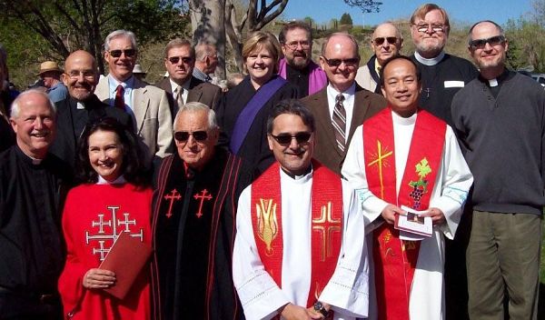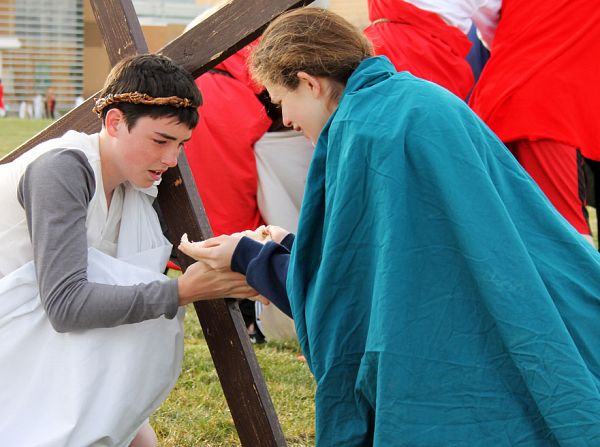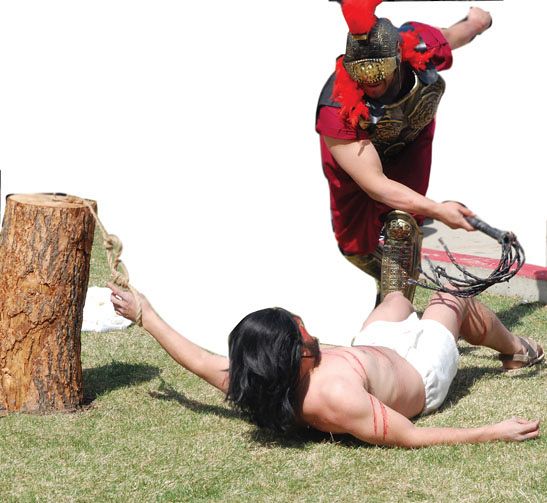 (First) Veronica gives Jesus a cloth to wipe his face, portrayed by students from Saint John the Baptist Middle School, who acted out the Stations of the Cross in the Skaggs Catholic Center courtyard. (Second) Raúl Rivera portrays Jesus Christ during the living Stations of the Cross at Saints Peter and Paul Catholic Church in West Valley City. The ‘blood’ from the scouring is actually red dye. IC photo/Laura Vallejo (Third) Father Oscar Martin Picos, pastor of Saint George Parish, and Father Tai Nguyen, parochial vicar, (in white) led over 250 faithful of all ages on Good Friday in the 7th annual Ecumenical Way of the Cross. Leaders from 13 religious communities participated in the procession that started at Bluff Street Park and ending in front of the Bishop Scanlan Catholic Center at St. George Catholic Church. A scriptural passage was read at each station along the one-mile route, with various people carrying the cross. As they proceeded to the next station, the group sang, "Were You There When They Crucified My Lord?" Courtesy of Carole Drake and Lorraine Boyce