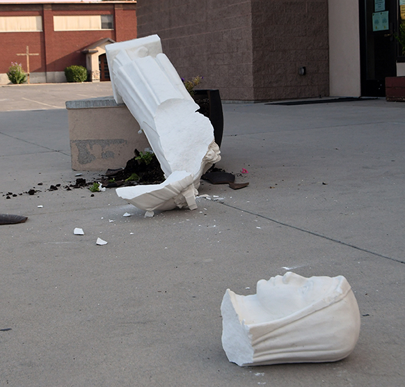 The statue of the patron saint of Saint Therese of the Child Jesus Parish, which stood in front of the church in Midvale, was toppled by an unknown person or persons sometime in the early hours of Sept. 14. Fr. Jose Barrera, the parish administrator, said the statue was in place at 11 p.m. Sunday night, but about 8 a.m. Monday morning, a parishioner noticed the damage. The parish, which over the past month has suffered other vandalism such as broken windows, filed a police report regarding the broken statue. IC photo/Marie Mischel
