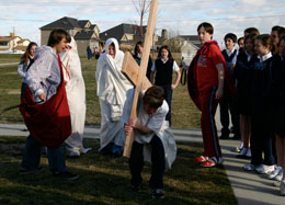 DRAPER — More than 1,000 students, teachers, and parents walked the Living Stations of the Cross on the grounds of St. John the Baptist Middle School March 19 and 20. The eighth grade religion class performed their stations at least 50 times between the two days. Many were in tears because it is not an easy thing to watch. "This is the seventh year the eighth grade students have performed the Living Stations of the Cross," said Peri Flanagan, St. John the Baptist eighth grade religion teacher. "It is so powerful to see teenagers re-enact the passion of our Lord, and it is fascinating to observe the children watching the re-enactment. They become so serious. Some of them watching have to turn away when Jesus is whipped and tortured." Flanagan said they begin on Ash Wednesday, the first day of Lent, and there is a lot of laughter and the students feel out of their comfort zone. They are scared, and it is awkward. But midway through Lent, they really start to become Jesus, Mary, Pontius Pilate, and the Romans. "When holy week arrives, it is the most beautiful way to re-enact the passion through our young, faithful people, and they do such a beautiful job," said Flanagan. "I am always in such awe every year. They really come to believe in what they are doing. "The students spend a lot of time preparing the reflection questions and prayers for each station," said Flanagan. "They try to make each one of them personal, powerful, and meaningful." "It is tough emotionally and it is hard spiritually to get a feel for what the people of that time period went through," said Keri Michalke, an eighth grader. "But by acting out the stations, we can get a feel for what they must have felt. "It made me sick to my stomach the first few times I acted out the station," said eighth-grader Bridget McNulty. "It scared me because I did not know exactly what I was supposed to do." "It is hard to portray these historical figures," said Michalke. "They went through so much that we will never experience in life. But we can only do so much and we really try hard to portray these people for everybody who watches our station." "Trying to be Mary was hard," said one of the students. "I don’t know how she did it." "We are trying to make people watching feel what they felt, and know this is not joke," said Saige Hoover. "This is real." "It was awkward being a Roman soldier because I was betraying Jesus, whom I believe in," said eighth-grader Josh Herricks. "I had to portray the Roman soldier by whipping Jesus and it was hard. It goes against what I believe in. But I know it was just part of the station. Doing the Live Stations of the Cross was a very spiritual and powerful experience."