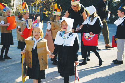 SALT LAKE CITY — Kindergarteners and first graders of The Madeleine Choir School enacted the first Thanksgiving feast Nov. 25 at the Madeleine Choir School. "I enjoyed seeing them talk about the things for which they are thankful, for example: being healthy, their parents, or being in this school," said Megan McGill, first grade teacher. "They aren’t materialistic," she said. The kindergarten students worked on different projects such as painting their own turkey and churning butter in preparation for their Thanksgiving celebration. "You’ve made butter!" said Jamie Kmetzsch to her students, who looked at the butter container in awe. The kindergarteners then walked outside in their Native American costumes to meet their fellow first-grade "pilgrims." In a gesture of unity defying differences, each Native American held hands with a pilgrim and strolled toward the little gym, where a feast of turkey, cranberries, and pumpkin pie was waiting. Parents were also part of the celebration and were taking pictures, setting up, and cleaning. Jody Gross, a parent volunteer, said she sent an e-mail asking for help "and within an hour all the slots were filled." "The kids were working on this all week. They’ve been talking about the history of Thanksgiving Day and about the songs they’ve learned," said Laura Murphy, who took the day off work to help with the activities of her daughters’ classroom. "I just did not want to miss it," she said.