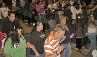 DRAPER — A group of 156 high school students from throughout the Diocese of Salt Lake City quickly blossomed into a friendly, enthusiastic, and happy crowd after bonding at the Autumn Catholic Teen Social 2006 at Juan Diego Catholic High School Oct. 22. The social was sponsored by the Diocesan Youth and Young Adult Ministry Office and offered a workshop on dating and relationships, a workshop on listening to music and its effects, lunch, a concert with audience participation, and a dance. Mass was celebrated at St. John the Baptist Church by Father Samuel Dinsdale, associate pastor of St. Mary of the Assumption Parish, Park City. Joshua Blakesley, a Christian singer and song writer from Alexandria, La., was the keynote speaker, who also put on a concert along with his band. His Christian music journey began in 1992, while he was in high school and involved with a school peer ministry team. He saw the power of God at work in the lives of teens and watched them become transformed into believers. He also realized the impact and the power of true praise and worship music offered in his own walk with Jesus, and he vowed to spread the Gospel from that point on. Blakesley serves as the young adult coordinator and assistant music director at Our Lady of Prompt Succor Parish in Alexandria, which is French for "hasten to help." He travels around the nation speaking and singing at youth conferences and rallies, and at workshops for musicians. In his workshop "Changing Your Tune," he said his goal was to create an awareness of the positive and negative the effects song lyrics can have on people. "Music is powerful and creates or draws on the emotions we are feeling," said Blakelsey. "I have a message and a reason I want to convey in every song I write, as does every singer-song writer. I don’t want to change the music you listen to, but since music is a large part of a teenager’s life, I want you to be aware of how the music you listen to affects your mood and your emotions." The students also learned how to handle their emotions while dating at a workshop presented by Chad and Kelly Rosamond, who are former youth ministers from St. Ambrose Parish, Salt Lake City. "Dating should be about having fun and the dignity and respect of others, not about who you are going to marry," said Kelly. "Dating is having social engagements with a person of the opposite sex to create a friendship. Love is not simply warm, fuzzy feelings or the thought of sexual attraction or desire. Love is a decision you make. Real love chooses what is best for one another. Sexual pleasure is sacred and should only happen between a married couple. Outside of marriage it is called fornication or adultery" The Rosamonds presented a Catholic examination of the sixth commandment, "You shall not commit adultery," and ninth commandment, "You shall not covet your neighbor’s wife." They explained terms such as chastity, sex, procreation, lust, impurity, licentiousness, and adultery. Panel members made up of high school and college males and females clarified the definition of terms such as hanging out, hooking up, public display of affection (PDA’s), getting it on, and making out. The panel said one should be careful in using these terms because the meanings differ greatly between groups of friends, high school students, and college students. The panel also said the man should pay for the date unless the woman initiated the date, but men appreciate it when women offer to pay. When asked if women like men driving fast, the panel said, "No." The panel said it is polite for a man to open the car door for a woman and make sure he gets her home on time. "The national divorce rate in America is 50 percent," said Kelly. "The divorce rate among Catholics is also 50 percent. But the divorce rate is only three percent among Catholics who practice natural family planning and follow the Catholic Church’s teachings. A list of sources is posted on the Office of Youth and Young Adult Ministry website at www.dioslc.org/departments.