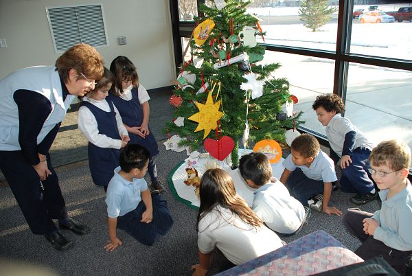 Students at Kearns-St. Ann School learn about Christmas traditions at a Jesse Tree. The tree was created by seventh graders at the parish religious education program under the direction of Dora LaVoie. LaVoie on December 14 took children from the extended day program to the Jesse Tree, where they talked about the symbols many of which came from the Old and New Testaments. Clockwise from top, LaVoie and preschoolers examine hand-made ornaments; the Jesse Tree stands in the window of St. Ann Church; symbols of the lion, bread, and wheat remind us of God's strength and the bread of the Eucharist; the symbols on the Jesse Tree include the dove of peace, a shepherd's staff, a milk jug, and a scroll containing the Word of God.