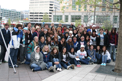 SALT LAKE CITY — More than 500 high school and college students, and other interested participants, tied themselves together with a rope to abduct themselves and peacefully protest the use of child soldiers in Uganda April 25. They walked from President’s Circle at the University of Utah to the Gallivan Center in downtown Salt Lake City to draw attention to the atrocities of the Invisible Children in Uganda who are kidnapped to fight, and sometimes forced to kill their own families. This Invisible Children-led rally, themed "The Rescue" was held in 100 cities across nine countries, to bring attention to the plight of the children abducted and forced to fight as soldiers in Central East Africa. The Juan Diego Catholic High School Human Rights International Club (HRI), an Invisible Children group from Judge Memorial Catholic High School, abducted themselves for the abducted. The Gallivan Center served as their symbolic "refugee camp". They remained abducted until a person of influence such as a celebrity, government official, and the media arrived to rescue them. It was a success. After many phone calls to all the television stations, the daily newspapers, the Intermountain Catholic, senators, and representatives, Senator Bob Bennett was reached at 7 p.m. in his office. At 7:30 p.m. he arrived to rescue them. Sen. Bennett read the Rescue Anthem, "There are those who expect the unexpected, those who cast their vote for hope, those who believe that good will triumph over evil. We are those people. We are the masses, misfits, moguls, media, millennials doing what we can now, with what we have. Our voice, our impact is only limited by our willingness to change…." The students wrote more than 800 letters to President Barack Omaba and government officials to gain attention. The attention generated from similar events held in Washington D.C. widely contributed to the start of the peace talks between the Lord’s Resistance Army (LRA) and the Government of Uganda, supported by special envoys from the United States and other nations. The LRA is led by Joseph Kony, who is wanted by the United Nations for war crimes against humanity. It is hoped the attention from this event will mobilize greater international efforts. "We are here representing Juan Diego because we have been involved with Invisible Children for three years now," said Braelyn Beltran. "We have raised over $100,000 for Invisible Children. We abducted ourselves to raise political awareness against a 22-year war in Northern Uganda. "We need to get the attention of political people who can really make a difference," said Elana Jadallah. "Our letters bring attention to the atrocities being committed by the LRS against the children, and ask the political officials to take immediate action to protect children from their attacks and bring peace. "Ten million people have been displaced from their homes into camps," said Beltran. "Kids had to night commute sometimes 40 miles so they would not be abducted. In 2006 we did "Global Night Commute," and in 2007 it was "Displace Me." "No one knows, that is the reason they are invisible, so we have to get the word out," said Jadallah. Judge Memorial’s Emily Burchett said, "It was a really powerful statement for people in cars to see all of us tied to a rope walking. It definitely spread the awareness like we wanted it to by having this event." "Thank all of you for coming out today," said former Mayor Rocky Anderson. "It’s cold and wet, but you are demonstrating to this entire community, and that is what this is all about – raising awareness that you are not going to put up with this any more. Joseph Kony has been doing this for 22 years when the entire world has been turning a blind eye. Just as the entire world has been turning a blind eye to the genocide in Sudan. And the reason the nation did not lift a finger was because there was not a movement like this. It is all up to us."
