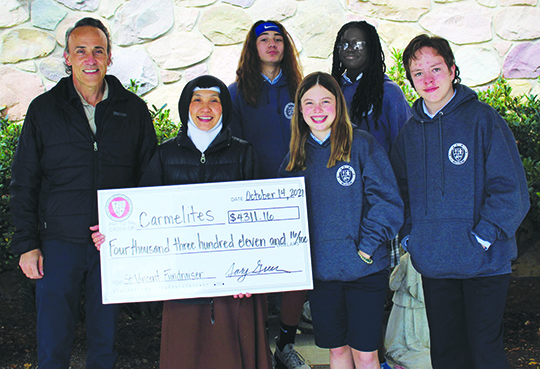 St. Vincent de Paul School raised $4,311.16 through its student council Penny Challenge fundraiser event to help the Carmelite nuns in Salt Lake City, who were not able to hold their fair fundraiser event this year. The school administration thanked all the families for supporting the event, which they said was one of the school’s best fundraisers in a long time. Members of the student council are shown with their school principal, Gary Green, and Mother Therese Bui, OCD of the Carmel of the Immaculate Heart of Mary.
