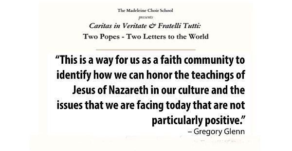 SALT LAKE CITY — As part of implementing the diocesan Pastoral Plan, Bishop Oscar A. Solis has asked The Madeleine Choir School to take a stronger lead in adult faith formation in the Catholic community. To help in this endeavor, Gregory Glenn, the school’s pastoral administrator, will facilitate Two Popes | Two Letters, a study series on two papal encyclicals, Caritas in Veritate by Pope Benedict XVI and Fratelli Tutti by Pope Francis. The sessions will be held on Tuesday evenings from Sept. 26 to Oct. 24 at the school and via Zoom.