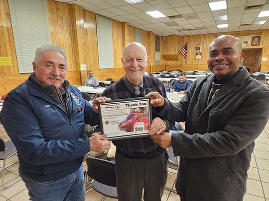 David Matyjasik, State Special Olympics chairman for the Utah Knights of Columbus, presents a certificate to Council 12264 celebrating their support of a Special Olympics athlete; the support allows an athlete to compete in Utah Special Olympics activities for an entire year. Shown from left are St. Patrick Council 12264 Grand Knight Larry Martinez, David Matyjasik and St. Patrick Parish Administrator Fr. Anastasius Iwuoha.