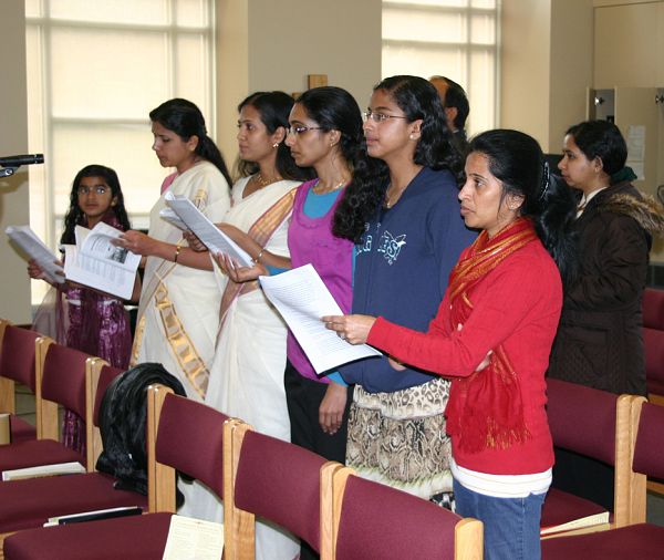 Father Alex Vellappaly (left) distributes communion to Dixy Thomas. Fr. Alex is visiting from the Diocese of Kanjirappally in India, and celebrated the traditional Syro-malabar Mass at Saint Catherine of Siena Newman Center on April 15, where he has been staying since August. The prayers were in English and the Mass hymns were sung in Malayalam by friends of Fr. Alex from Kerala, India, who are members of Saint John the Baptist Parish in Draper. The Mass was sponsored by St. Catherine of Siena men’s group, who also invited the men’s group from Saint Ann Parish in Salt Lake City to attend. "The Syro-malabar church in India is fast-developing in the world," Fr. Alex said, adding that there are communities in different parts of India and around the world including the Diocese of Chicago. It has always been in communion with the Vatican and is the second largest Eastern Church. Its liturgical calendar has nine seasons. IC photos/Christine Young