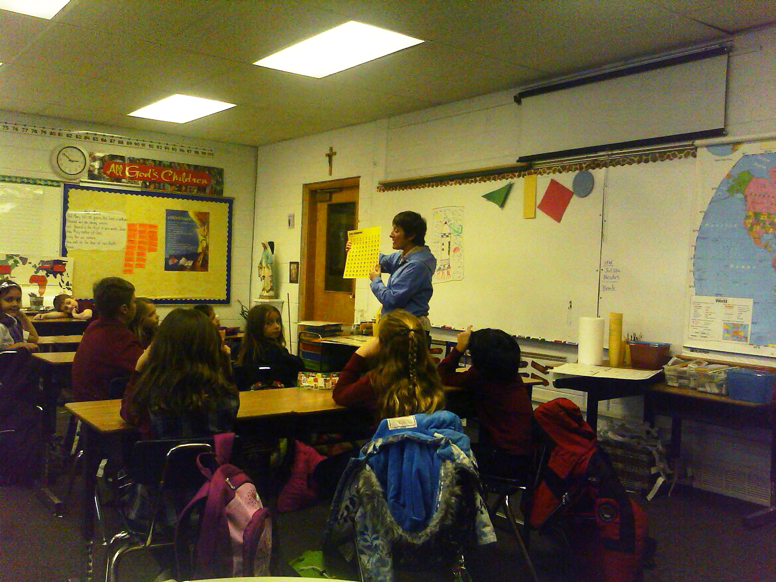 BOUNTIFUL – Every student at Saint Olaf School has the opportunity to learn a second language. This effort started last school year because of the interest of Jo Ann Emery, principal, and with the help of Kimberly Turner, the Spanish teacher. "Ms. Emery was interested in kids having a foundation in Spanish," said Turner, who started working at the school 14 years ago. All of the St. Olaf students in grades kindergarten through eighth grade have at least 10 minutes every other day of Spanish instruction, which includes speaking, reading and writing. "We do a lot of practicing, but of course they are in a different scale so I have to do different things with the Spanish," said Turner. When she arrives in the classroom, she starts singing the names of the objects on the chart for that day. The items may be drawings or words in English and in Spanish. As she sings the words, the students repeat them. "Monday…Lunes…Tuesday…Martes," you can hear in the classroom. "I think is important that they hear it, that they see it, and that they can write it," said Turner. "We do a lot of practice with the languages." In today’s world languages are an important part of many schools’ curriculum. "We are traveling with different ethnics and nationalities here in our area, and it is important to learn the different cultures," said Turner. Even though Turner is used to teaching in the middle school, she has found teaching the elementary students challenging, but fun and rewarding. For example, the kids in first grade were struggling with the alphabet in Spanish, but to Turner’s surprise they were able to recite it by themselves when they were called upon to do it. "In the first grade we used to struggle with the alphabet, even last week, and today I told them that I needed to rest my voice so I was letting them say the alphabet, and they all together said it by themselves," said Turner adding that she loves the little kids. "They are darling. They just love to learn." Giving students an appreciation for the language while they are very young is a way of giving them a solid foundation that will help them in their future, she said. "When they grow up and become a doctor or an attorney or such, it’s very important that they have that background and are able to communicate with other people of different nationalities. As Americans, it is sad that we do not have different languages. It’s important that we bring this here to the students. I know it is important job-wise and for their futures."