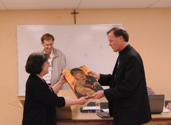 The Most Rev. John C. Wester, Bishop of Salt Lake City (right), blesses a Theotokos icon that was presented to Dr. Juliana Boerio-Goates, immediate past president of the Diocesan Pastoral Council, in recognition of her service. The DPC’s current president, Deacon Jack Clark (center), made the presentation at the March 24 council meeting. To the back of the icon, Deacon Clark attached a poem that he wrote titled ‘Vladimir Mother of God – Theotokos.’ The poem reads: ‘Two human faces looking on. To each other, each is drawn. Each to the other "I am that you should be." Both cleave for the sake of Holy Deity, for salvation of all humanity."’