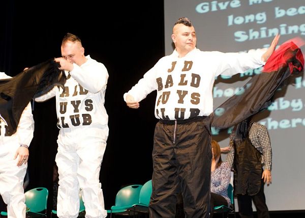 Slowly, Colosimo stood, a laurel wreath adorning his head, and extended an arm to the students. Members of Juan Diego’s newly formed "Bald Guys Club" in white jumpsuits bearing the club name emerged from the wings and flanked Colosimo. Teacher Scott Platz and junior Dominic Colosimo, the masters of ceremony, introduced the "headmaster" and his fellow inductees into the Bald Guys Club: teachers Daniel Sontum, Josh Clark, Brandon Sluga and Casey Sutera.