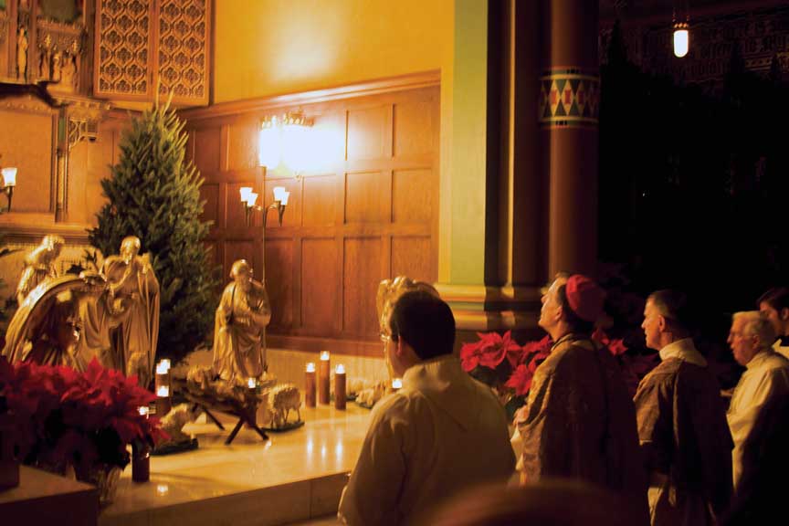 SALT LAKE CITY — "Welcome everybody as we celebrate the coming of Christ into our Church, into our world, and into our lives," said the Most Rev. John C. Wester, Bishop of the Diocese of Salt Lake City, at the celebration of Midnight Mass in the Cathedral of the Madeleine Dec. 25. Tickets were necessary if you wanted to be seated. Some of those without tickets stood in the perimeters of the church just to be in the solemn and peaceful atmosphere. The Choir of the Cathedral of the Madeleine and the choristers of The Madeleine Choir School sang beautifully prior to and throughout the Mass. Bishop Wester welcomed in a special way seminarians Rocky Conner, Jr., and Christopher Gray, who are studying for the priesthood to minister in this diocese, and retired Father Matthew O. Wixted, who concelebrated the Mass with Bishop Wester, and who served in the Cathedral some 40 years ago. In his homily Bishop Wester said on behalf of Father Joseph Mayo, pastor of the Cathedral of the Madeleine, Father Omar Ontiveros, the staff of the Cathedral and the Pastoral Center, and on behalf of our priests, deacons, religious, and lay leaders, I want to wish all of you and your families and the Diocese of Salt Lake City a very blessed and peaceful Christmas. "This peace is one of the greatest celebrations we can center on in a biblical sense between God and human beings in this time of Christmas," said Bishop Wester. Bishop Wester spoke of the peace that ushers us into right relationships with God. A peace that we pray will have an affect to end the terrible wars and genocide, poverty, and violence that besets our world. Bishop Wester said Christ’s coming was first announced to the shepherds. The shepherds were among the poorest of the people. They were living off the land, could not observe the temporal rituals, and were looked down upon. Although we have since romanticized the shepherds, they were not living a very pleasant life. Yet, they were the ones to whom the angels turned. "We are reminded that since the shepherds were the first that the angels came to announce the good news to, that we must, too, give a priority to the poor in our midst, those who are struggling in these economic times," said Bishop Wester. "We also keep in mind those who are outside tonight. Jesus was born outside. Mary and Joseph could not find room at the Inn. We remember the homeless, immigrants and refugees, children who have run away from home, those who are victims of bigotry of any kind, the sick in their own isolation, those who are mourning the loss of loved ones, and those for whatever reason exist on the edges in our society. We identify with them all because all of us are like those shepherds, all of us are poor. All of us are in need of Jesus Christ our redeemer and our savior." Bishop Wester referred to a story about a parish priest who, after celebrating many Christmas Masses, was tired. He went to his sister’s house for dinner and sat down in a chair to take a nap before dinner. But his niece came up and said, "Uncle Mike, I want to show you something." "So they went over to the manger scene," said Bishop Wester. "It was a gorgeous ceramic manger scene that had been in the family for many generations. It was intricate, so delicate, and beautiful. Fr. Mike was so pleased that his niece understood the true meaning of Christmas. She was not getting all those toys and presents. "Fr. Mike said, ‘Sarah, what is this?’" Sarah answered, ‘It’s fragile,’" said Bishop Wester. "Fr. Mike said, Oh, that’s true it is fragile.’" "There is a path one could take on that reflection, to say, Jesus became fragile for us," said Bishop Wester. "Jesus became vulnerable. God, all powerful, all mighty, all knowing, all loving, took on our form, and took on the form of a slave. And, that is a beautiful reflection. "But I want to just briefly ask you, and me, on this Christmas night, what about the image itself?" asked Bishop Wester. "Maybe Sarah is right on the mark. It is fragile, it is a beautiful image filled with memories and even sentimentality. It brings back many happy days for so many of us. We might want to pause in front of the manger scene and say, there is the true meaning of Christmas. "But is it possible that indeed this image is in fact fragile, and perhaps is it supposed to be fragile?" asked Bishop Wester. "Can it be broken and should it be broken? Here is what I mean. "God became one of us so that God could engage us in a relationship of unfathomable intimacy so that you and I can be one with God," said Bishop Wester. "It is something that is even hard to say. We can be one with God in the person of Jesus Christ. This person of Jesus Christ is far more than simply an infant. The infant is a very important part of the whole mystery, the incarnation. But it is only one part. If we fixate only on that part, and that is all Christmas is, then it needs to be broken." Bishop Wester said Saint Francis teaches us that the wood of the manger reminds us of the wood of the cross. The infant Jesus whom we adore tonight, is the same Jesus who died on the cross for us to bring us redemption. He is the same Jesus Christ who moves us from darkness to light, from sin to grace, and from death to light. He is the same Jesus Christ who never intended just to remain as a baby, but intended to grow, and age in wisdom and grace. He intended to accept the cross, and intended to suffer for us, and to die for us, and to rise again on the third day. "Midnight is the time of Christmas. It is the traditional time when we believe Christ will come again. The symbolic time, when Jesus Christ will gather all of creation together in himself and bring us as one to the father. Therefore, this baby Jesus is much more than that. He is one who seeks to radically change us, and transform us, and to constantly draw us into new life. Christmas is for children, and it is wonderfully so. But it is also for those of mature faith, and those who wish t