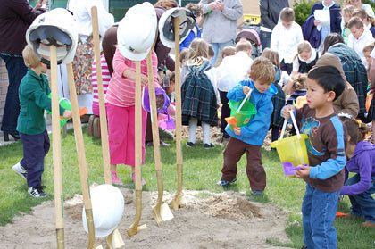 DRAPER— Families, staff members, the mayor of Draper, clergy, kids and friends gathered on May 12 for the official groundbreaking of the expansion of the Guardian Angel Day Care at the Skaggs Catholic Center. A warm welcome to those present, followed by a prayer conducted by Deacon Dale Dillon of Saint John the Baptist Catholic Church in Draper, opened the small ceremony "We are here because this was a vision that needs to begin with infants working with God every day," said Molly Dumas, advancement director at Juan Diego Catholic High School, "and that’s why we want to expand this program. Draper is growing. We are keeping up with Draper, but we want to do more than just child care; we want to have God and prayers in our day care with our children, so that’s why we are expanding." The day care will expand 9,000 square feet. The expansion will allow for two new rooms for 1-year-old children, two new rooms for 2- and 3-year-olds, and also two new infant rooms, as well as remodeling for the existing interior. A new playground also will be constructed. "We are doing it with a lot of hands," said Dumas, adding, "we especially want to thank the person that it’s making all this possible; this has been put together with a special gift from Michael Kampros." Kampros wasn’t present at the groundbreaking, but his daughter, Willow Rapella, unveiled the artist’s rendering of what the day care will look like. Rapella, an associate teacher and Virtues /EDP teacher at Guardian Angel Day Care, donated the land for the project. "She came in to my office one day and said that her father had left her a large estate and she wanted to help Guardian Angel to expand," said Maria Carrizo, director of Guardian Angel. "My jaw dropped." At the time, the plans for the expansion were already drawn but the staff was anticipating having to take a loan out for the construction. "I’m feeling very excited and proud because the demand of the infant/toddler (care) here in this side of the valley is so high right now," said Carrizo. "There are a lot of people searching for good-quality child care for infants and toddlers." The construction is scheduled to be done by December 2010, and the facilities will be operating by the first of next year. During the ceremony, the infants, toddlers and all the kids who attend Guardian Angel got sand from a pile with their shovels and poured it where the construction will begin. "So you kids are going to start the building with those pails and shovels; you are going to start building this school for you," Dumas said as the little ones started digging in the sand.