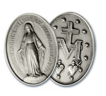 The Miraculous Medal was given by Our Lady to St. Catherine Labouré in the Rue de Bac chapel, Paris in 1830; it originally was known as the Medal of the Immaculate Conception. The front of the medal depicts Our Lady standing on a globe that represents “the entire world and every single soul in particular.” Rays of light extending from her fingers represent the many graces that the Blessed Mother bestows on all those who ask for them. Around the front of the medal is the prayer “O Mary, conceived without sin, pray for us who have recourse to thee.” The back of the medal bears a cross entwined with a large “M.” Below this image appear both the Sacred Heart of Jesus surrounded by a crown of thorns and the Immaculate Heart of Mary pierced by a sword. Around the back of the medal are 12 stars that represent Revelation 12:1, “a crown of twelve stars.”