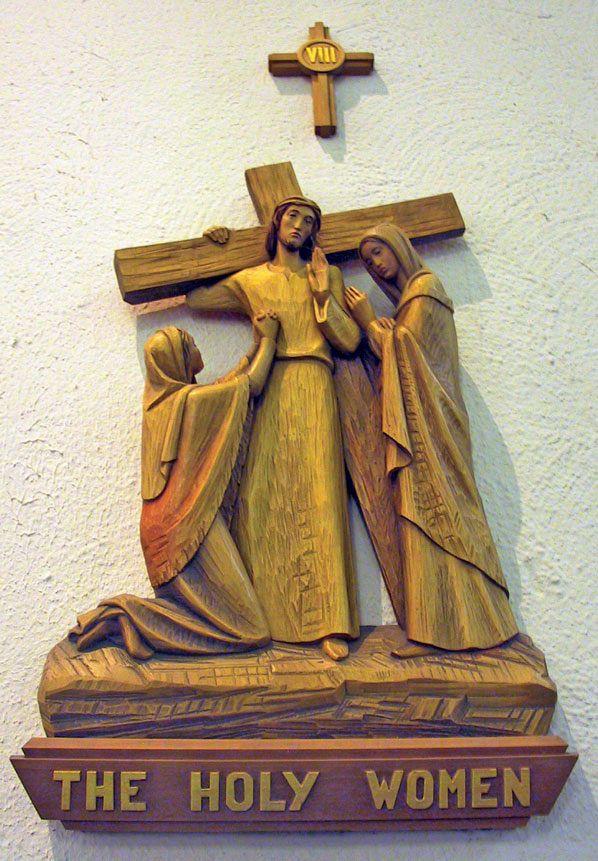 The Eighth Station of the Cross, Jesus Speaks to the Women and Children of Jerusalem, is found in St. Patrick Church in Salt Lake City. The stations were imported from Italy and are hand carved. St. Patrick Parish was founded in 1892. The women and children of Jerusalem cried when they saw that Jesus was hurt, but He told them not to weep for Him. They had seen his compassion and welcomed his words of healing and freedom. He had broken all kinds of social and religious conventions to connect with them. Now they are here to support him. He feels their grief. He suffers, knowing he cannot remain to help them more in this life. He knows the mystery facing the separation of death.