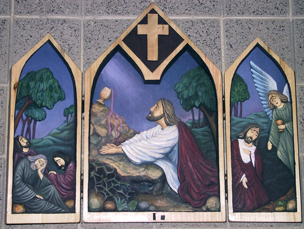 The First Station, Jesus at prayer in the Garden of Gethsemane, is found in St. Mary of the Assumption Church on White Pine Canyon Road in Park City. The Stations of the Cross that grace the interior of St. Mary of the Assumption are hand-carved triptychs in the motifs of Polish primitive art. They offer both a Lenten journey into the passion of Jesus and the Easter journey of the followers of Christ. The central and side panels on the interior carvings of each station depict the central moments of the passion of Jesus as found in the four gospels. These prayer moments invite the Christian to ponder the mystery of Jesus’ Passion according to Mark. The panels indicated, and the order of the stations, allow you to read Mark’s full account and prayerfully ponder his insights.