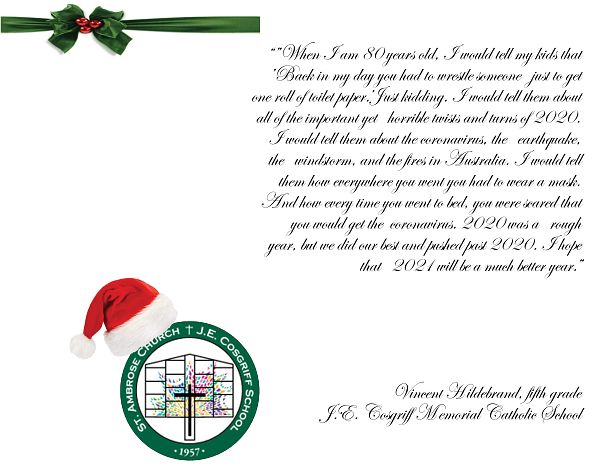 “When I am 80 years old, I would tell my kids that ‘Back in my day you had to wrestle someone just to get one roll of toilet paper.’ Just kidding. I would tell them about all of the important yet horrible twists and turns of 2020. I would tell them about the coronavirus, the earthquake, the windstorm, and the fires in Australia. I would tell them how everywhere you went you had to wear a mask. And how every time you went to bed, you were scared that you would get the coronavirus. 2020 was a rough year, but we did our best and pushed past 2020. I hope that 2021 will be a much better year." - Vincent Hildebrand, fifth grade, J.E. Cosgriff Memorial Catholic School