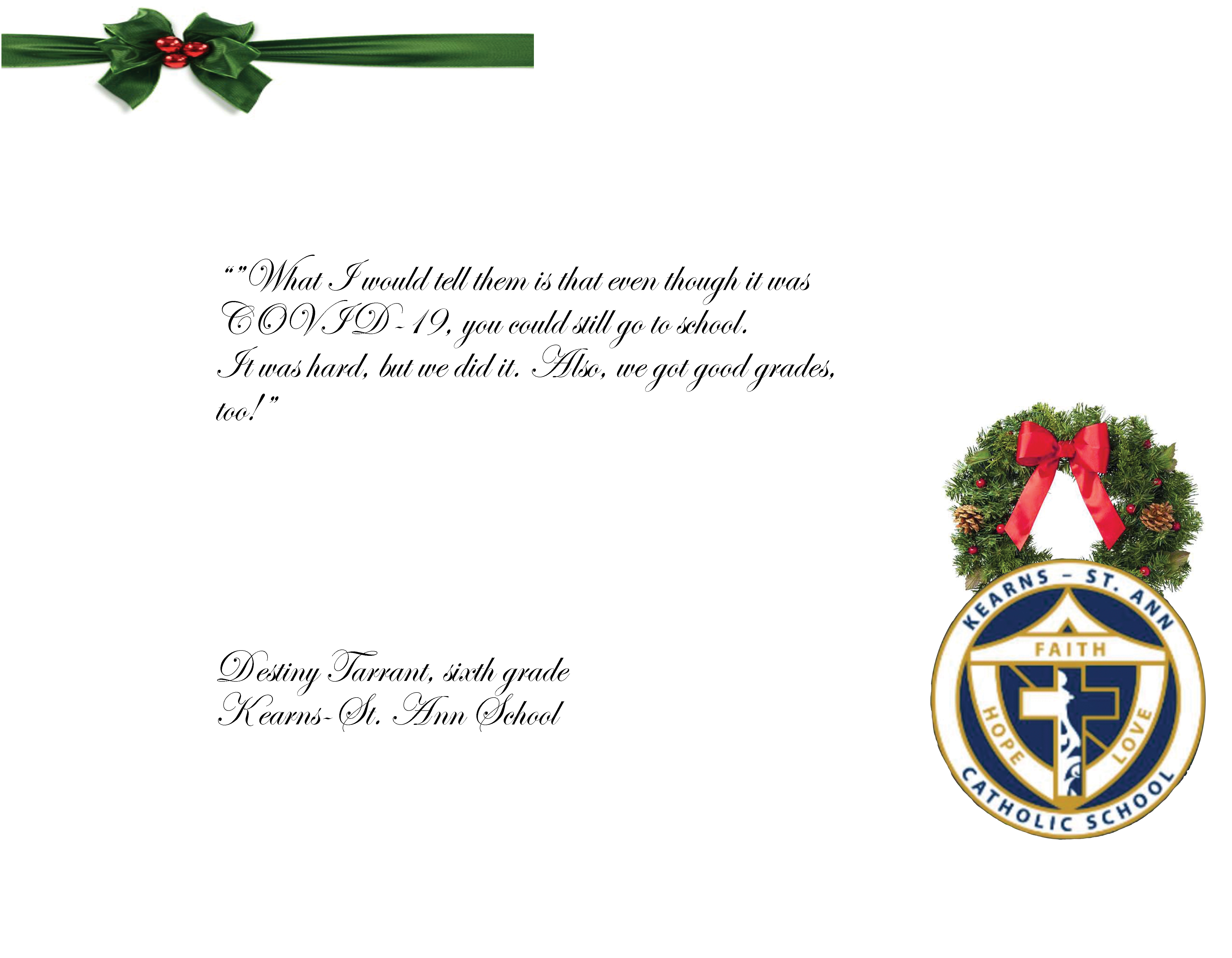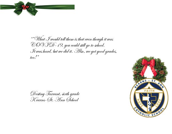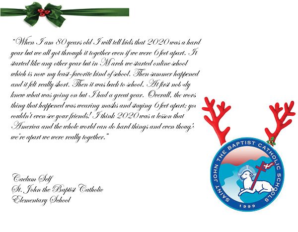 “When I am 80 years old I will tell kids that 2020 was a hard year but we all got through it together even if we were 6 feet apart. It started like any other year but in March we started online school, which is now my least-favorite kind of school. Then summer happened and it felt really short. Then it was back to school. At first nobody knew what was going on, but I had a great year. Overall, the worst thing that happened was wearing masks and staying 6 feet apart; you couldn’t even see your friends! I think 2020 was a lesson that America and the whole world can do hard things and even though we’re apart we were really together." - Caelum Self, fifth grade, St. John the Baptist Catholic Elementary School