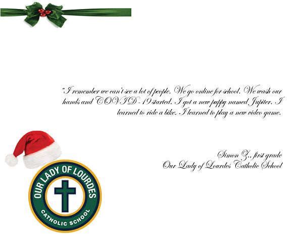 “I remember we can’t see a lot of people. We go online for school. We wash our hands and COVID-19 started. I got a new puppy named Jupiter. I learned to ride a bike. I learned to play a new video game." - Simon Z., first grade, Our Lady of Lourdes Catholic School