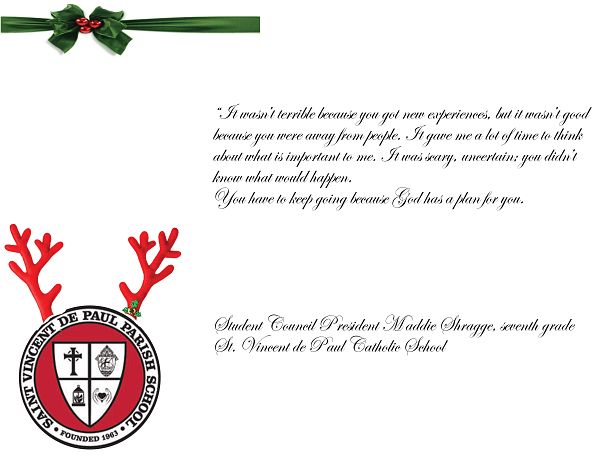 “It wasn’t terrible because you got new experiences, but it wasn’t good because you were away from people. It gave me a lot of time to think about what is important to me. It was scary, uncertain; you didn’t know what would happen. You have to keep going because God has a plan for you." Student Council President Maddie Shragge, seventh grade, St. Vincent de Paul Catholic School
