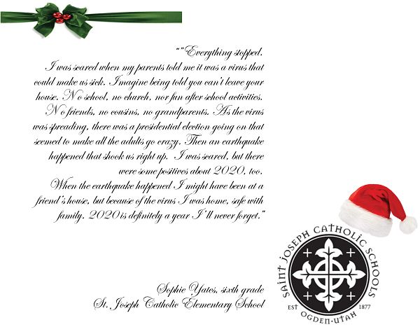 “Everything stopped. I was scared when my parents told me it was a virus that could make us sick. Imagine being told you can’t leave your house. No school, no church, nor fun after-school activities. No friends, no cousins, no grandparents. As the virus was spreading, there was a presidential election going on that seemed to make all the adults go crazy. Then an earthquake happened that shook us right up. I was scared, but there were some positives about 2020, too. When the earthquake happened I might have been at a friend’s house, but because of the virus I was home, safe with family. 2020 is definitely a year I’ll never forget." - Sophie Yates, sixth grade, St. Joseph Catholic Elementary School