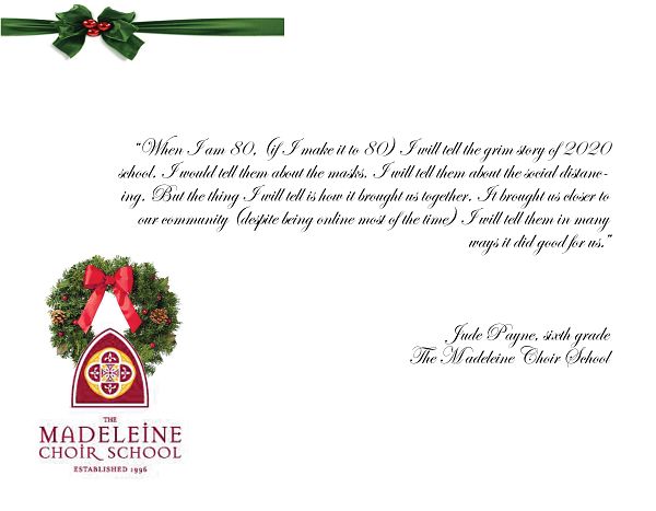 “When I am 80 (if I make it to 80), I will tell the grim story of 2020 school. I would tell them about the masks. I will tell them about the social distancing. But the thing I will tell is how it brought us together. It brought us closer to our community (despite being online most of the time). I will tell them in many ways it did good for us." - Jude Payne, sixth grade, The Madeleine Choir School