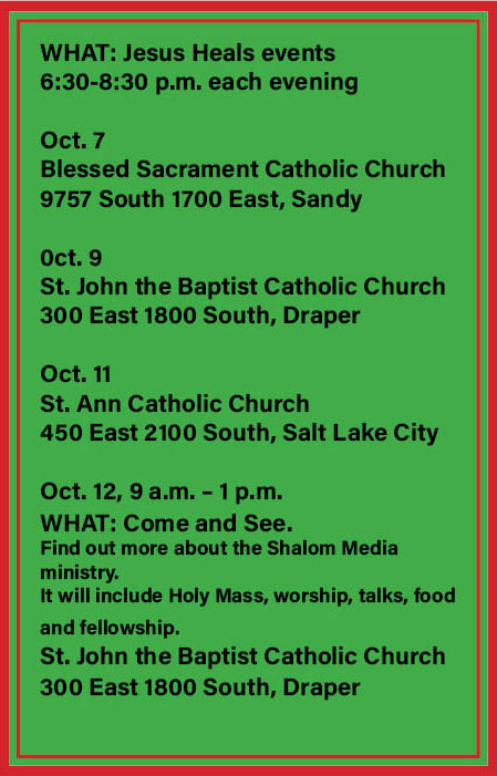 SALT LAKE CITY — Next week healing Masses will take place at three parishes in the Diocese of Salt Lake City. The Masses are part of the Shalom Media Jesus Heals ministry and are being brought to the diocese with the help of Paulson Puthur, a St. John the Baptist parishioner and Shalom Media’s international coordinator for prison ministry.