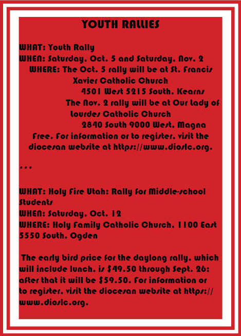 SALT LAKE CITY — The diocesan Youth and Young Adult Ministry has planned a busy fall season. In addition to organizing the youth component of the Utah Catholic Conference on Sept. 21, it is sponsoring three youth rallies across the Wasatch Front.