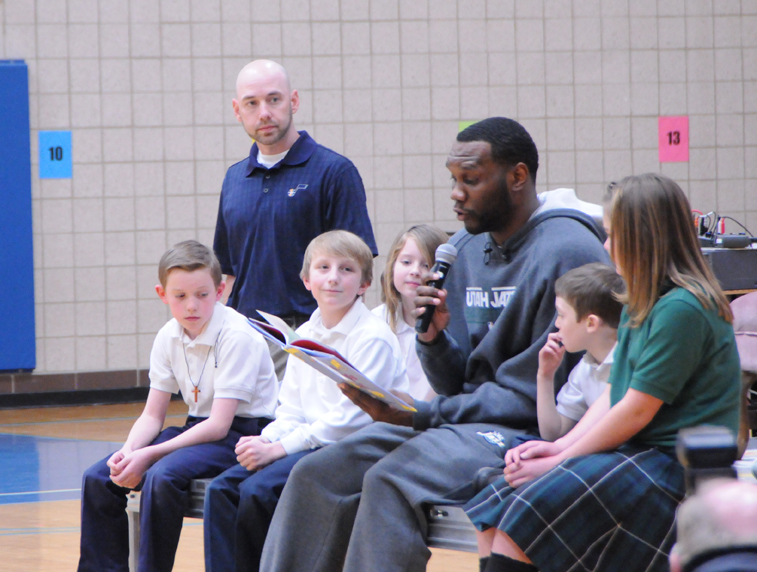 DRAPER — Five hundred fifty students in 19 classrooms at Saint John the Baptist Elementary School plus 816,948 minutes of reading time in one month added up to one Utah Jazz player visit to the school. In addition, fourth-grader Timothy McElaney was named the top reader and won a seat behind the Utah Jazz players’ bench as Coach for a Game, a photo with Head Coach Tyrone Corbin, four tickets to a game, and a dinner for his family at the Jazz 100 Club. The prizes were the result of SJB students in kindergarten through fifth grade winning the Utah Jazz Reading Contest ‘Be a Team Player - Read!’ This is the third year in a row that SJB has won the annual reading contest, said Bob Mutz, the school’s director of advancement. The contest is sponsored by the Utah Jazz, Scholastic Book Fairs, Russell’s Ice Cream and Stores Online. All Utah schools are invited to participate. During the contest, a weekly reading log was sent home with each SJB student. At the end of the four weeks, the Utah Jazz and Scholastic Book Fairs compiled each school’s score by dividing the total number of minutes read with the school’s enrollment. The top 10 schools with the highest average minutes-read-per-student had a Jazz player visit the school and read to the students. In addition, the top 10 schools earned an ice cream party from Russell’s Ice Cream. Utah Jazz center Al Jefferson visited the St. John the Baptist gymnasium on March 1, creating excitement among the parents, faculty, visitors and students as the 6’10" player from Mississippi entered. "We want the kids to read more and at the same time to have fun," said Patti Ball, Utah Jazz public relations director. "It’s pretty nice," Mutz said. "This is a real easy way to increase the kids’ reading skills. They really get excited about it. It’s an educational but fun way for the kids." Each year, teachers give individual reading goals to each classroom and tailor them to each student. "They do a really good job. Even the little kids are involved," said Mutz.