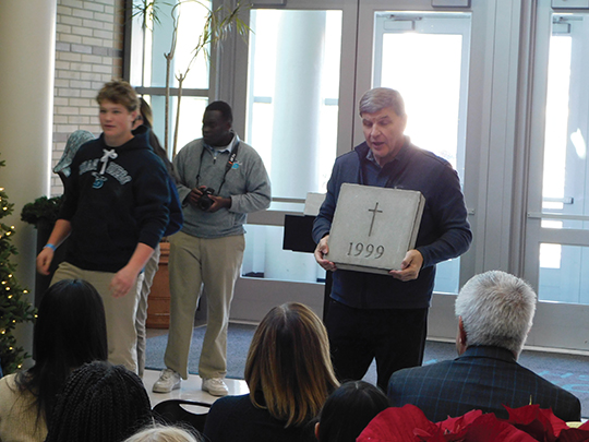 Students who attended kindergarten through 12th grade at the center joined Juan Diego CHS Principal Dr. Galey Colosimo and other faculty and school members at the opening of the time capsule.