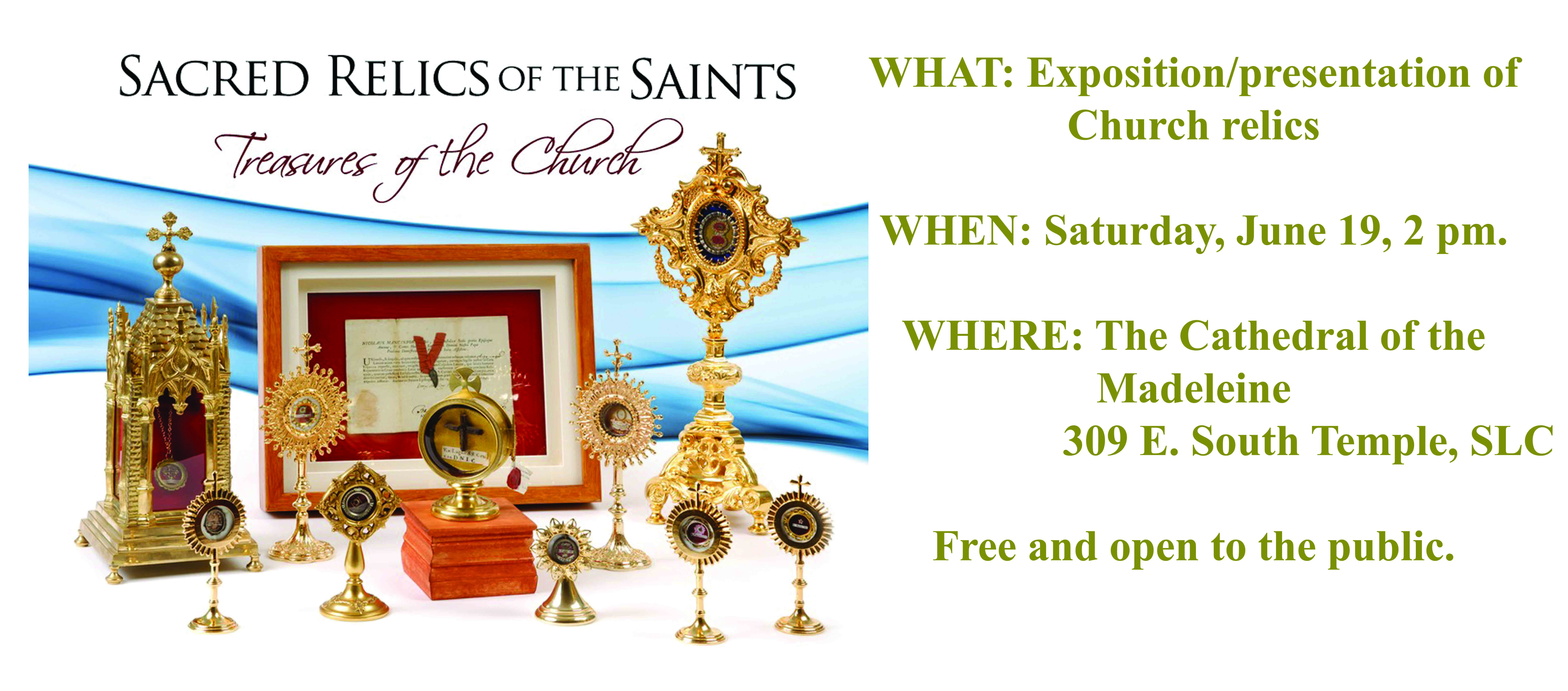 SALT LAKE CITY — The Cathedral of the Madeleine will host “Treasures of the Church,” an exposition of sacred relics on Saturday, June 19. Among the more than 150 sacred relics, some of which are 2,000 years old, will be those of St. Mary Magdalene, St. Joseph, St. Maria Goretti, St. Thérèse of Lisieux, St. Francis of Assisi, St. Anthony of Padua, St. Thomas Aquinas and St. Faustina Kowalska. There will also be a fragment of the veil that belonged to Our Lady, and some of the largest remaining pieces of the Wood of the True Cross in the world.