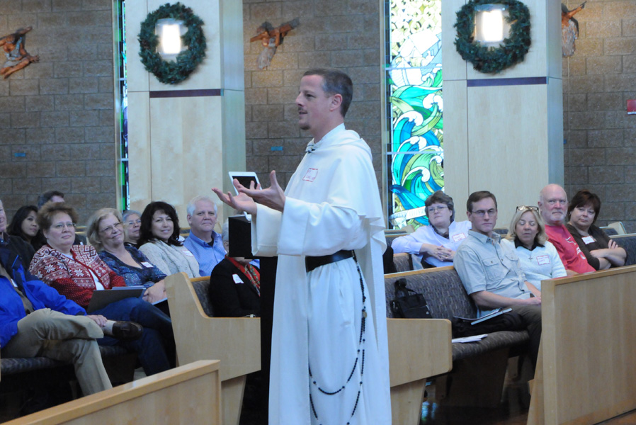 SALT LAKE CITY — Mary, the Mother of God, and Saint John the Baptist are wonderful companions for the Advent journey because each in a different way points to Christ, said Dominican Father Carl Schlichte, pastor of Saint Catherine of Siena/Newman Center, who led the annual Diocese of Salt Lake City Advent Retreat in English. The retreat, on Dec. 1 at Saint John the Baptist Catholic Church in Draper, drew about 400 people, 127 for the English section and 275 for the Spanish, which was led by Father Omar Ontiveros, pastor of Saints Peter and Paul Parish in West Valley City. This was the largest attendance ever for the annual event, said Ruth Dillon, director of the Office of Liturgy, which organized the event in conjunction with the Office of Hispanic Ministry. Advent, which began Dec. 2, is a time when Catholics prepare for Christ’s birth through prayer and repentance. Many parishes schedule Advent penance services, and having a retreat at the beginning of the Advent season is important because it "forces us to stop and listen to God’s presence in our lives," said the Most Rev. John C. Wester, Bishop of Salt Lake City, who attended the retreat. The event also was a chance "to just be able to relax with the Lord and let the Lord speak to us," Bishop Wester said. "Father Omar and Father Carl gave us the opportunity to pray and to think about God’s presence in our lives. They helped us prepare for Christmas." In his presentation, Fr. Carl focused first on Mary’s fiat, when she assented to God’s plan as presented by the angel Gabriel. "Mary’s companionship with us is that she can help us to know what it means to listen deeply, and the importance of listening," Fr. Carl said. If people listen, he added, "God will plant seeds and they will grow." By contrast, the Baptist’s call for repentance can be difficult to hear, but St. John also provides a model by his ministry; from the time he was in the womb he pointed to Christ and stirred others to follow Jesus, Fr. Carl explained. Therefore, "Mary is a good model [for us] to be better listeners; and John can be a model for action, to be witnesses to Christ," Fr. Carl said. The retreat drew people from throughout the Salt Lake area. Lisa Roblez, who joined a group of about 16 people from her parish, Saint Therese of the Child Jesus, said the time gave her peace. "I didn’t realize that just thinking about Mary would bring me peace, but it does," she said. "It brings me peace that she was more than just his mother, she was the champion of his life." The event was a "great start to Advent," said Kevin McHugh, a Saint John the Baptist parishioner, who attended with his wife. "It refocuses you to start thinking about your faith ... thinking about what you really need to be thinking about and not caught up in the clutter and the noise and everything else." Likewise, another St. John the Baptist parishioner, Mel Leivsla, said he and his wife will be able to take some ideas from the retreat "and do some celebration in our house this Advent," which they haven’t in the past. Saint Francis Xavier parishioner Francisco Lujan, who has just been assigned the position of director of religious education for his parish, had a powerful moment during one of the retreat’s periods of private prayer. "I was ... struggling, needing to clear my mind, and all of a sudden it was like Jesus was kneeling in front of me, washing my feet, and I thought, ‘That’s him calling me to more service,’" Lujan said. The idea of companions appealed to Connie Kruger, a Saint Martin de Porres parishioner who attended partly for recertification in the religious education program. "Our small group really talked about the idea of the dynamics of the people that we were interacting with and how they utilized that to bring God first and foremost in their lives," she said. That every participant took away a different message from the retreat was a good sign, said Fr. Carl, because that meant that the Lord was speaking to them through him.