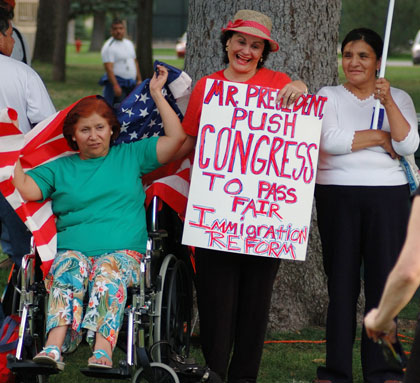 SALT LAKE CITY Una tormenta de pasiones pasó por Salt Lake City del 29 al 31 de agosto cuando el Presidente George W. Bush, la Secretaria de Estado Condoleezza Rice, y el Secretario de Defensa Donald Rumsfeld llegaron a Salt Lake City para dirigirse a los participantes de la Convención Anual de Legionarios en el centro de convenciones Salt Palace. Demostraciones a favor de la política exterior del Presidente Bush y de la guerra en Irak compitieron por llamar la atención con protestas en contra de la guerra y en contra de Bush y con demostraciones de inmigrantes. Una demostración de solo tres hombres llamada "Muerte a Israel" fue sobrepasada por una demostración de media docena de hombres pro Israel que se encontraban enfrente de la calle. Los manifestantes anti Israel pasaron la mañana del 30 de agosto tratando de pagar $10 por hora a los que pasaban por el lugar si aceptaban portar sus pancartas. Voces individuales cuestionaron el status de Utah como uno de los estados más rojos del país, ya que la demostración más concurrida fue "Nosotros el Pueblo por Paz y Justicia", la cual se realizó en Washington Square y fue definitivamente una protesta anti Bush. El Rev. Tom Goldsmith, maestro de ceremonias de la demostración "Nosotros el Pueblo" llevada a cabo el 30 de agosto les pidió a los presentes «Decir no a Bush, no a Rice, y no a Rumsfeld». Añadiendo que el Presidente Bush se debía de preparar para «una gran dosis de la verdad» cuando llegara más tarde a la Ciudad. «Cuando carecen de apoyo en Utah, ellos tienen problemas.» Aaron Davis, miembro de Veteranos por la Paz, dijo que, como un defensor de los veteranos y consejero de los derechos de los soldados, «Yo hablo todos los días con veteranos y soldados sobre los beneficios y los problemas que existen en el sistema de servicios médicos de la Administración de Veteranos. Muchas personas en este estado no pueden entender como podemos apoyar a las tropas y al mismo tiempo oponernos a la guerra. Esta forma de pensar, ciega y politizada ha creado una gran división.« «El ejército que puede derrotar al terrorismo no porta uniformes, o maneja Humvees®, o ejecuta invasions aéreas. No tiene un alto comando, o alta seguridad, o un gran presupuesto. El ejército que puede derrotar al terrorismo va a la batalla silenciosamente limpiando campos minados y vacunando niños. Debilita dictaduras militares y presiones militares y socava fábricas donde explotan a los trabajadores y mina los intereses especiales. Donde el pueblo se siente que carece de poder les ayuda a organizarse para lograr un cambio, y donde las gentes tienen gran poder, les recuerda que tienen responsabilidades.» A doce cuadras de ahí, en Liberty Park, Legionarios y sus familias escucharon a varios presentadores quienes llamaron a los que protestan la guerra en Irak "antipatriota" y "antiAmericano." Cuando el Fiscal General de Utah, Mark Shurtleff se paró a hablar, llamó a Rocky Anderson, Alcalde de Salt Lake City, «estúpido» por oponerse a la política exterior del Presidente Bush y a la guerra en Irak. Palabras de enojo casi ahogaron la voz suave y elegante de la Dra. Iman Algobory, una doctora de Irak quien habló acerca de la paz con la cual la gente de su país sueña: «Queremos vivir en paz. Los insurgentes que están atacando a la gente Iraquí no son Irakíes. No sabemos nada de guerrilleros suicidas. Ellos vienen de afuera.» Más tarde, el partido Republicano de Utah volvió a usar Washington Square para llevar a cabo su propia demostración a favor de Bush, en la cual estuvieron como presentadores Shurtleff y el Senador Robert Bennett momentos antes de ir a recibir al Presidente Bush al aeropuerto. Después de hablar en la demostración pro Bush, el Representante Chris Cannon se dirigió a una manifestación de inmigrantes en Liberty Park organizada por el grupo Proyecto Latino de Utah. Aunque la asistencia fue baja, James Yapias, hermano de Tony Yapias quien es el organizador de Proyecto Latino, aprovechó la oportunidad para hacer notar que la mayoría de los inmigrantes Hispanos no pudieron asistir porque aún estaban trabajando. «Infórmense acerca de la democracia de los Estados Unidos, y eduquen a sus hijos,» él les recordó a los presentes, «porque ellos serán los que un día votarán».
