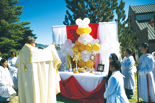 Cantando tanto en inglés como en español la procesión se dirigió hacia la parroquia de Santo Thomas de Aquinas. Algunas personas revisaban sus teléfonos para encontrar las letras de las canciones. Nos detuvimos en algunos hogares en donde los feligreses habían rea-lizado decoraciones con altares para darle la bienvenida al Santísimo Sacramento. En cada ocasión nos arrodi-llábamos, orábamos y recibíamos una bendición