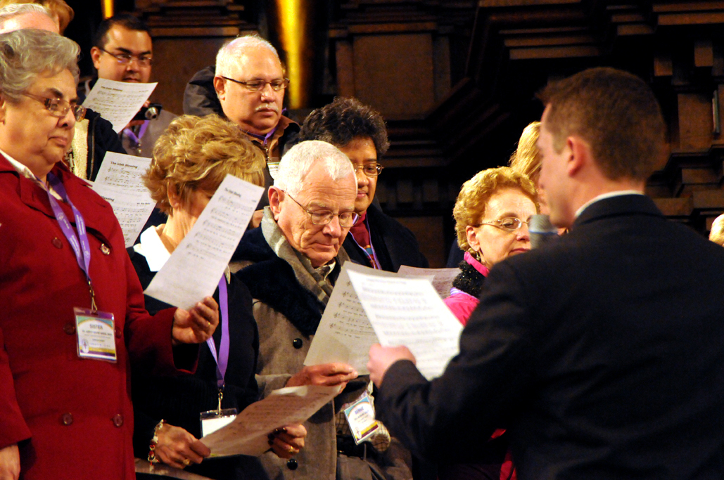 SALT LAKE CITY— Una visita al Temple Square, el cual es la sede mundial de la Iglesia De Jesucristo de los Santos de los Últimos Días, fue organizada como un evento especial previo a la inauguración de la Conferencia Litúrgica del Suroeste 2011 que se realizó del 2 al 5 de febrero en Salt Lake City. Decenas de Católicos tanto de Utah como de otros estados de la nación se unieron al tour. "Esta es mi primer vez en Salt Lake City y entiendo que este es uno de los principales lugares turísticos", dijo la Hermana Dominica Jeanne Wiest de St. Peter Fisherman en Eagle River Wisconsin. Los Católicos locales estaban entusiasmados por enseñar la cultura del estado a los visitantes. "Me gusta que la gente de otrso lugares visite el Templo", dijo Rosalie Merabelli, feligrés de la Iglesia Católica de Saint Ambrosse en Salt Lake City. "Creo que es importante ya que es parte de nuestra cultura. Aunque soy Católica creo que es importante que las personas que nos visitan conozcan el Temple Square". El tour fue organizado ya que las personas sienten curiosidad acerca de la iglesia LDS "y quieren que todos nos entendamos y comprendamos mejor", dijo la Dr. Juliana Boerio-Goates, miembro organizador del comité del SWLC y feligres de la Iglesia Católica de san Francisco de Asis en Orem. El anfitrión oficial del tour fue el Elder Ben Banks, quien es el director de recibimiento de la iglesia LDS. Entre las personas que hablaron acerca de la historia del coro del Tabernáculo y del órgano estuvieron Mac Christensen, presidente del Coro del Tabernáculo; Richard Elliott, el organista principal del coro y Ryan Murphy, director musical asociado. "El coro esta formado por 360 cantantes voluntarios cuyas edades van de 25 a 60 años de edad, todos excepcionales talentosos músicos", dijo Christensen. Todos los miembros del coro y los 110 miembros de la orquesta son voluntarios sin paga quienes se presentan y ensayan todas las semanas, dijo Christensen. Ryan Murphy, quien anteriormente trabajaba para una Iglesia Católica en Boston, y quien ahora funge como director asociado del coro llego a Utah en el 2009. Murphy fue quien dirigió al grupo de Católicos para que cantaran "Music of the spoken worls", una partitura no denominacional. "Me dijeron que cada uno de ustedes tiene una gran voz; que son unas personas muy entonadas", dijo Murphy a lso participantes del tour. Antes de cantar Murphy hizo que el grupo se pusiera de pie y realizara ejercicios de calentamiento. El tour al Temple Square incluyo la visita al Centro de Conferencias, a los centros Sur y Norte para visitantes y al Centro Humanitario. "Es fascinante", dijo Sheryll Scott, de la Arquidiócesis de Galveston en Houston.