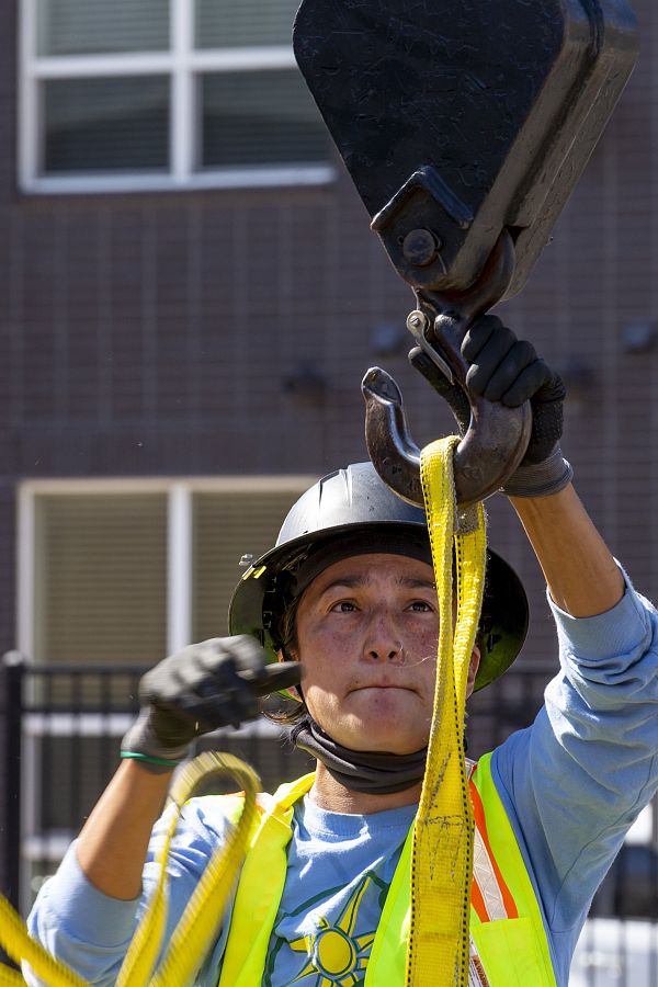 A workers in Denver lifts solar panel equipment to the top of a new affordable housing building July 2.