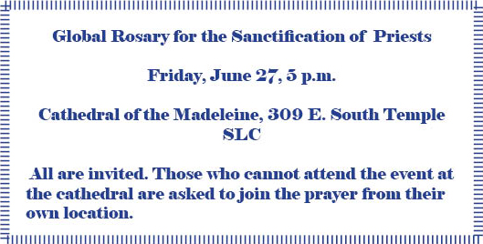 SALT LAKE CITY — Bishop Oscar A. Solis will lead the faithful during local participation in the Annual Global Rosary for the Sanctification of Priests on June 27, the Feast of the Sacred Heart of Jesus.