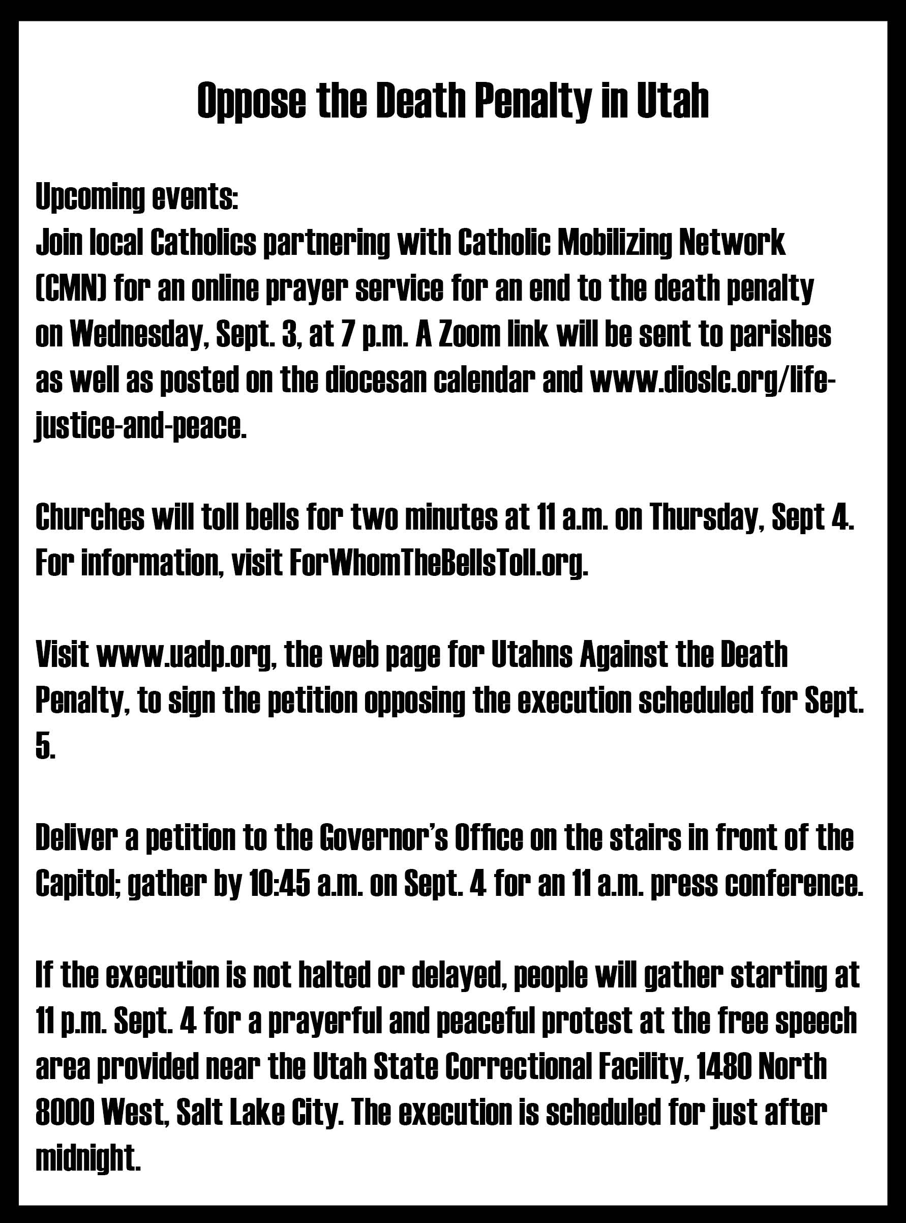 Prayerful and Peaceful Protest – If the execution is not halted or delayed, people will gather starting at 11 p.m. Sept. 4 for a prayerful and peaceful protest at the free speech area provided near the Utah State Correctional Facility, 1480 North 8000 West, Salt Lake City. The execution is scheduled for just after midnight.