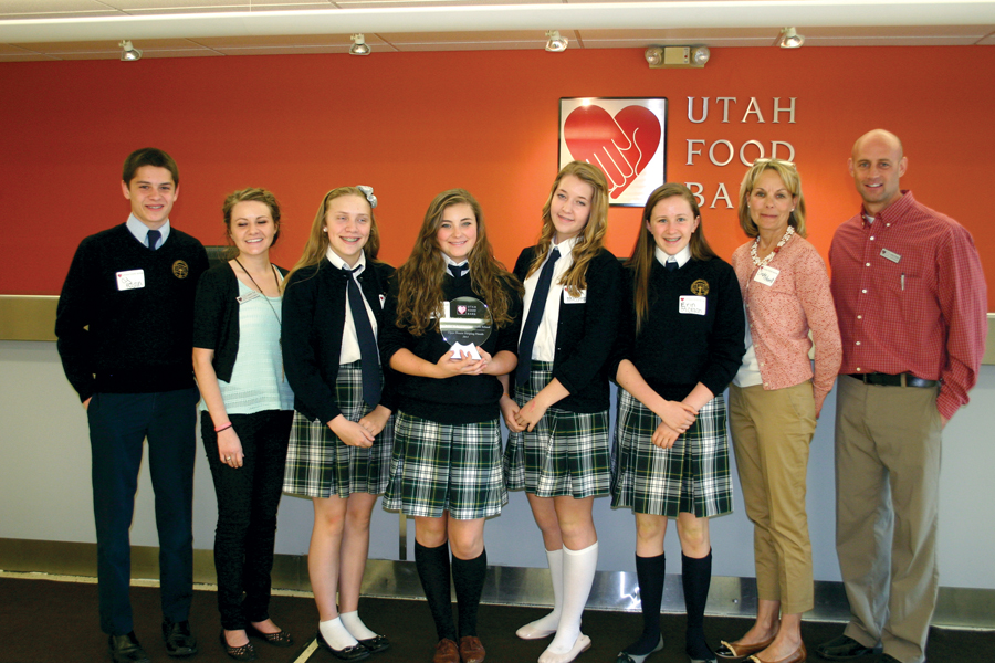 SALT LAKE CITY — The Utah Food Bank recognized the J.E. Cosgriff Memorial eighth-grade class as the School Group of the Year for its monthly service. Five eighth-grade students and Cindy Hunt, eighth-grade teacher, were presented with the award at the "Open Hearts Helping Hand" volunteer appreciation luncheon at the Utah Food Bank April 11. "It has been an honor for our class to volunteer each month at the Utah Food Bank," said Cy Austin, representing the eighth-grade class. "We have witnessed firsthand the concept of social justice at work in our community. My classmates and I have learned so much from the Utah Food Bank about how many people go hungry every day and about teamwork and responsibility. We now know that even helping a little matters to those in need, and have a better understanding of how important volunteerism is in reaching out to others." Cosgriff Principal Betsy Hunt instills in the faculty and students the importance of giving back to those who are less fortunate, said Lauren Tuft, Utah Food Bank volunteer coordinator. "It is as important to create social awareness as it is to provide a strong academic foundation," she said. "The eighth-grade class volunteering at the Food Bank is a natural extension of this school philosophy. We want to express our gratitude for how well these students worked together." A key component of the school’s religious and ethical instruction is for all students to understand the critical importance of serving those in need both in the neighborhood and in the world at large, Betsy Hunt said. "This work experience at the Utah Food Bank has helped our eighth-grade students know that their effort and work throughout the year truly has had a positive impact on the life of others," Betsy Hunt said. "The students felt a sense of pride in sorting and preparing edible food for the hungry and at the same time the students were humbled by the many people in Utah who go hungry each day." The eighth-grade class served once a month at the Food Bank. "The Utah Food Bank educates its volunteers about the importance of what they do, how many people they serve and that they help people throughout the state," said Cindy Hunt. "There is no downtime; volunteers work hard and we tried to get as much done as we could for them." Eighth-grader Erin Morgan had fun and "I also bonded with my classmates," she said. Sarah McGregor said, "They help the elderly all the way down to infants." Abbi Mancini thought it was great the Food Bank also accepts dog and cat food donations for distribution to those with pets. "I also learned a good work ethic and how to keep up and keep going," she said. Utah Food Bank Chief Marketing Officer Ginette Bott said, "It is always so impressive to us when we see the youth and young families come to the Food Bank [as volunteers] because we know that the next generation is learning how important it is to be able to give back to the communities." Jordan Roberts, Utah Food Bank volunteer manager, agreed. "We recognize the value of service that comes from children and teens; we know they are our future leaders. If we can develop that compassion and service ethic early, we know it will add to a better society. The Cosgriff students were fantastic and a tremendous help and they seemed to have a good time."